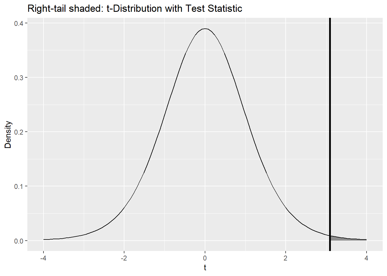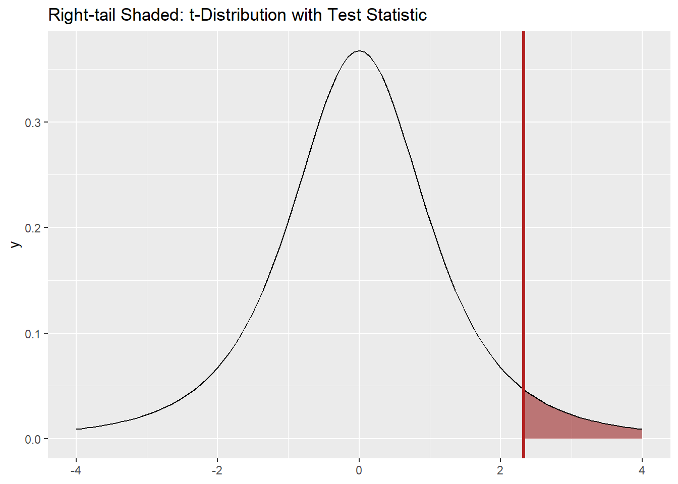 labs(title = "Right-tail Shaded: t-Distribution with Test Statistic")