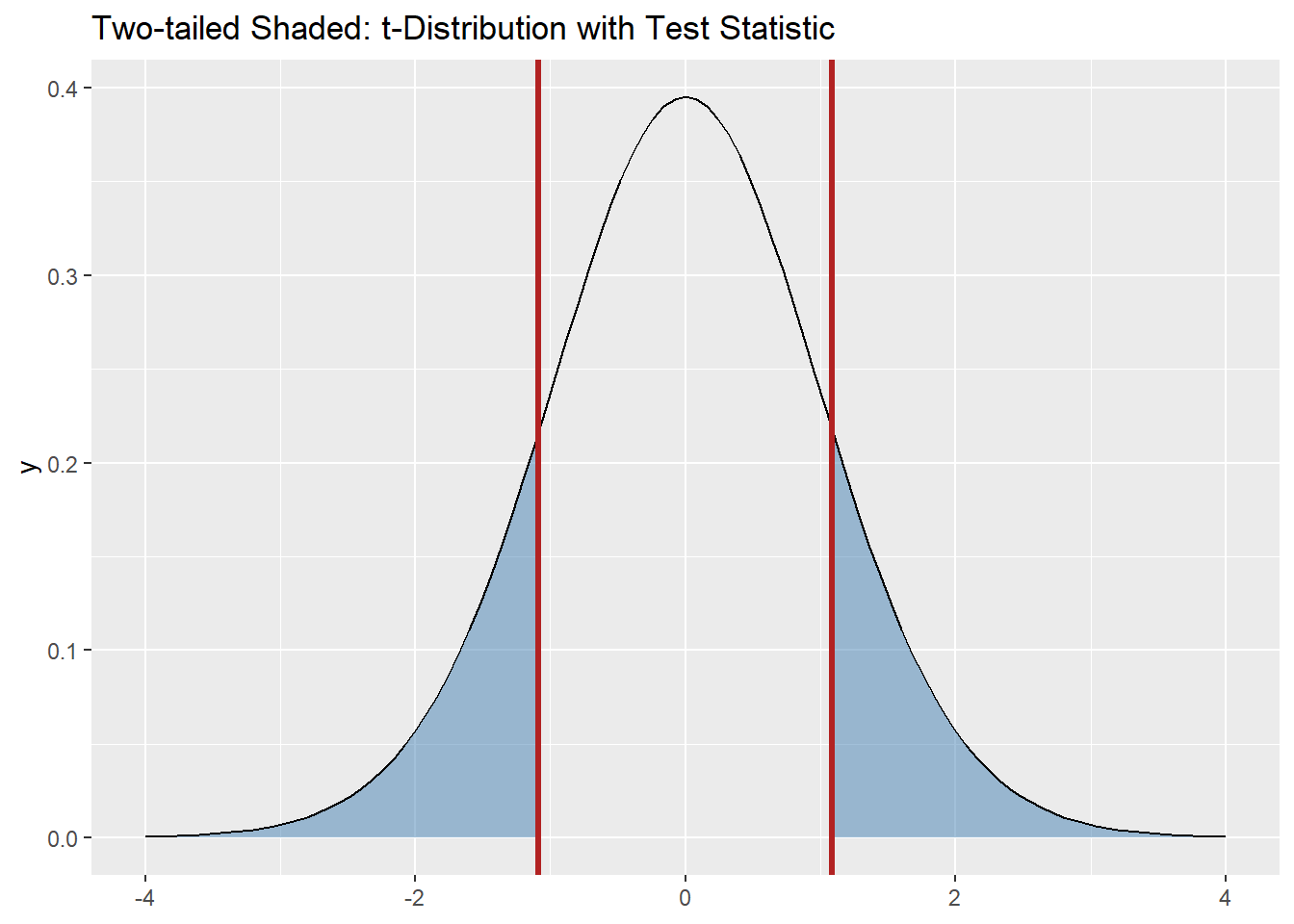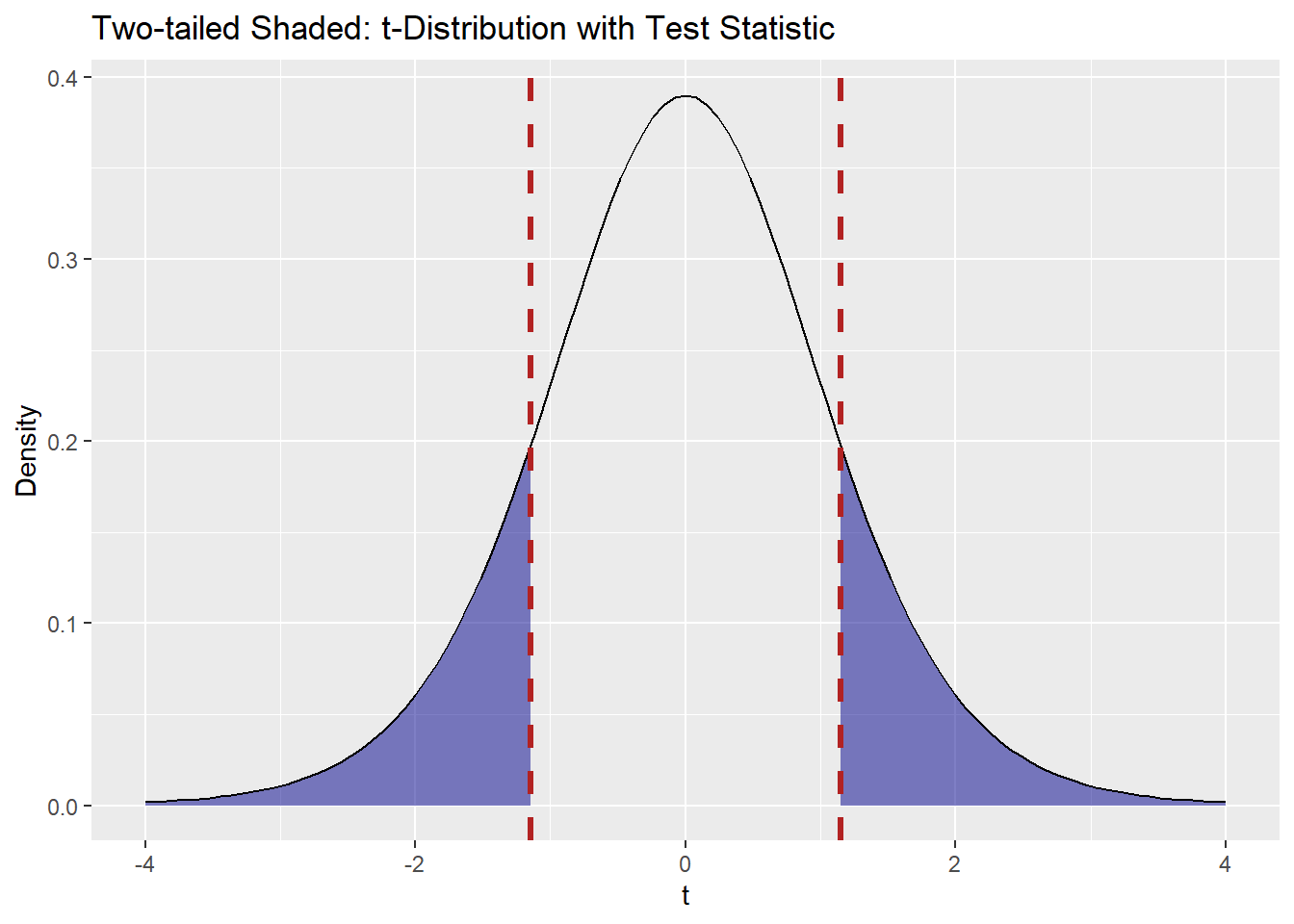 labs(title = "Two-tailed Shaded: t-Distribution with Test Statistic",
