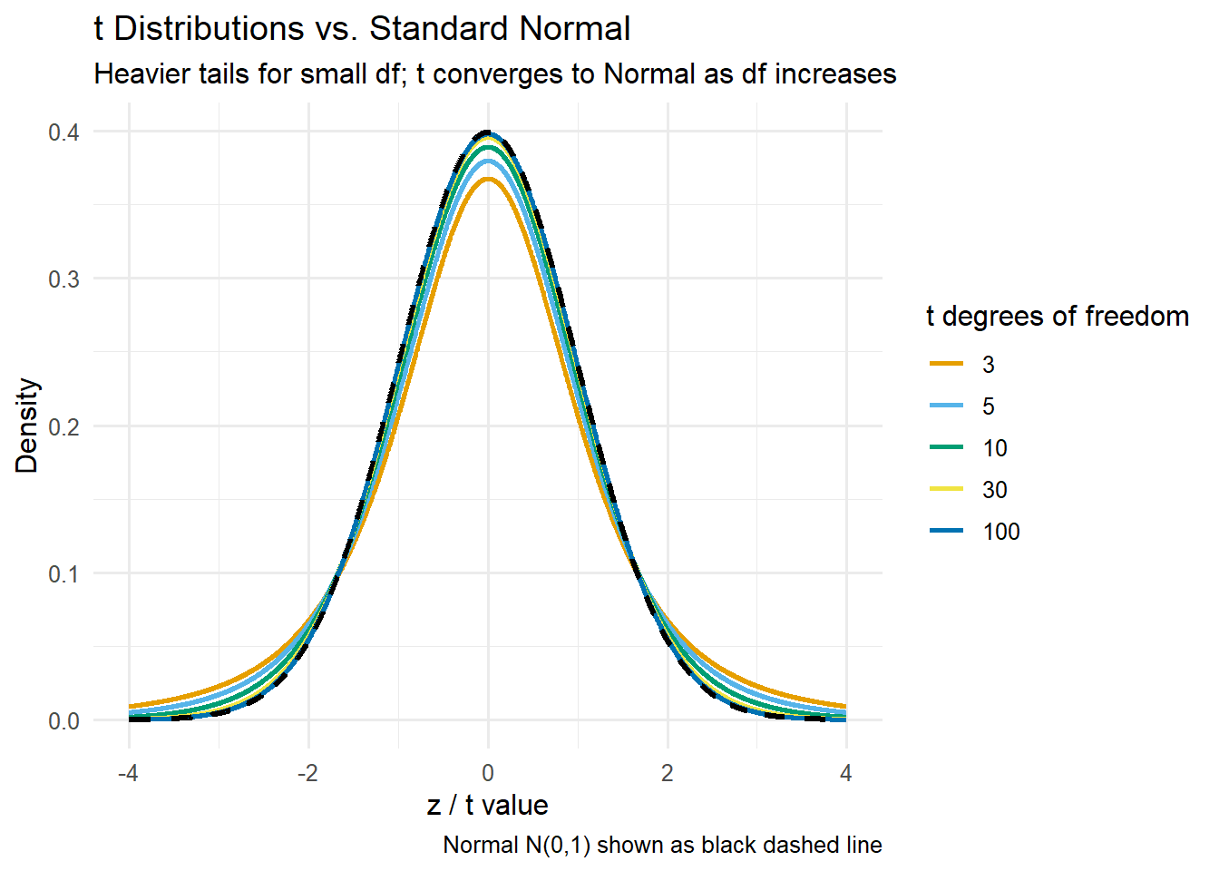 Overlay several \(t\) distributions with different degrees of freedom and the standard normal \(N(0,1)\) for comparison.