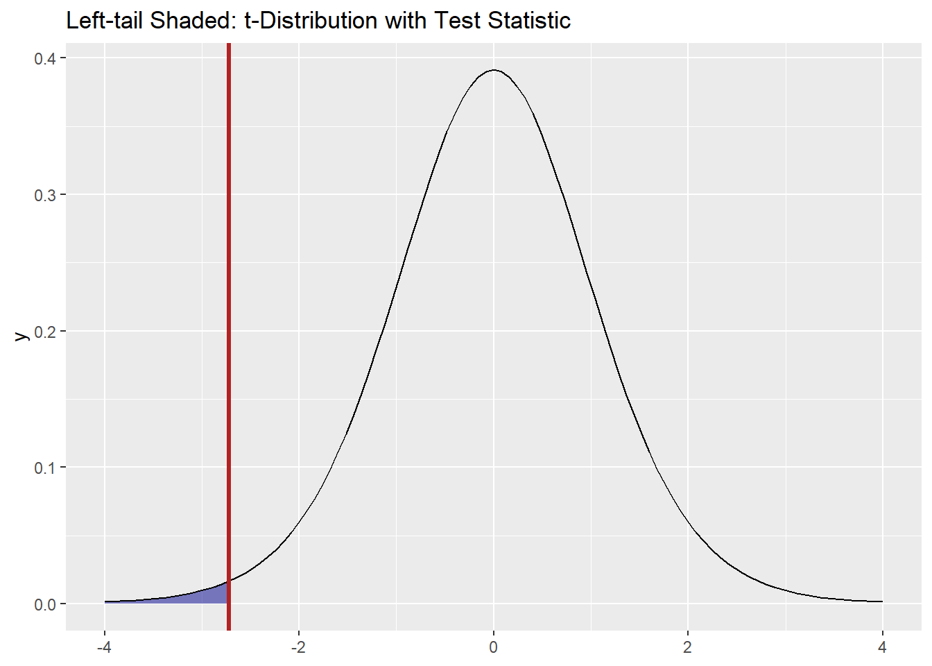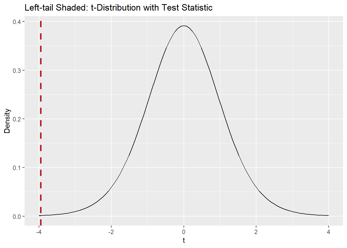 labs(title = "Left-tail Shaded: t-Distribution with Test Statistic")
