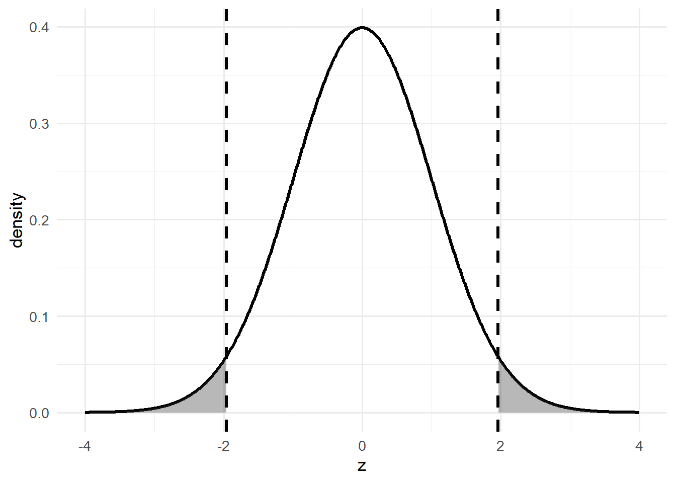So our critical values are about \(-1.96\) and \(+1.96\).