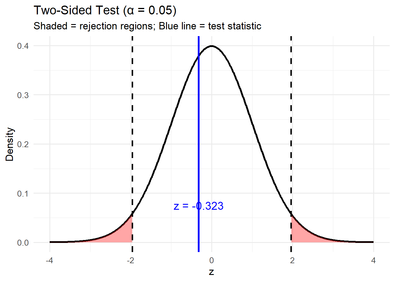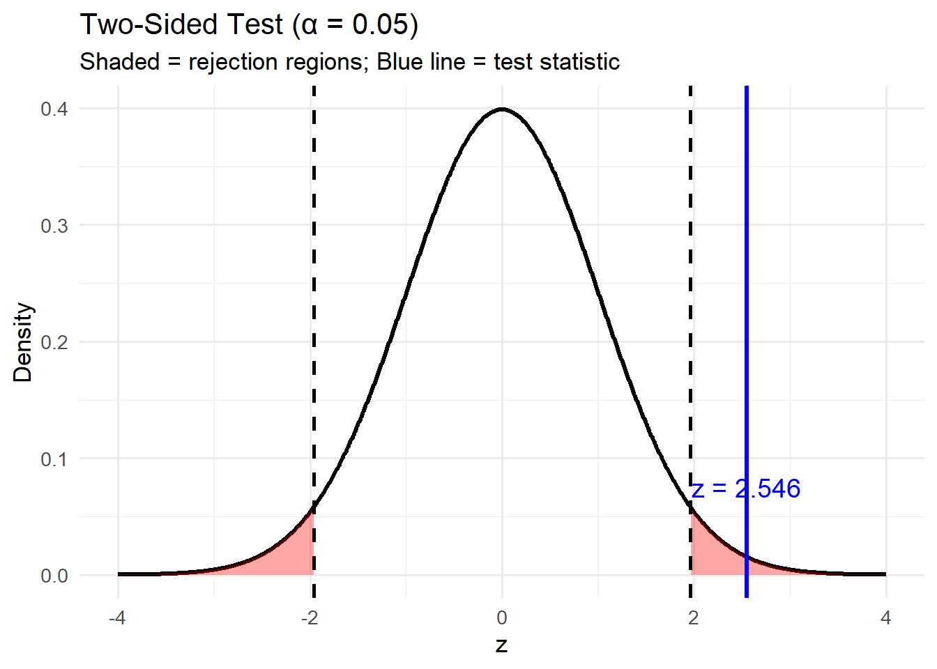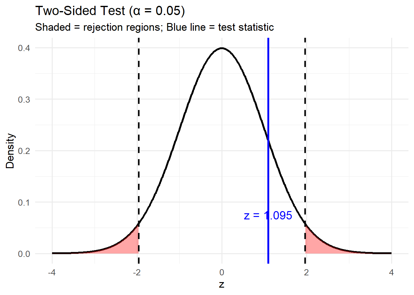 | \(H_A: p \neq \pi_0\) | \(p = 2 \cdot (1 - \Phi(|z|))\) | p_val <- 2 * (1 - pnorm(abs(z_stat))) |