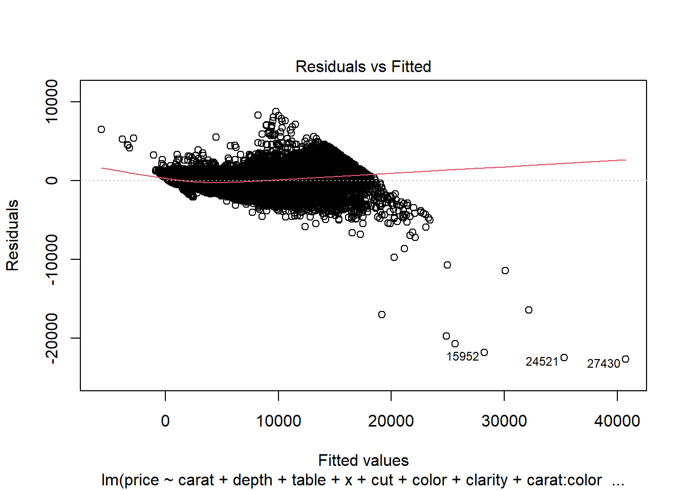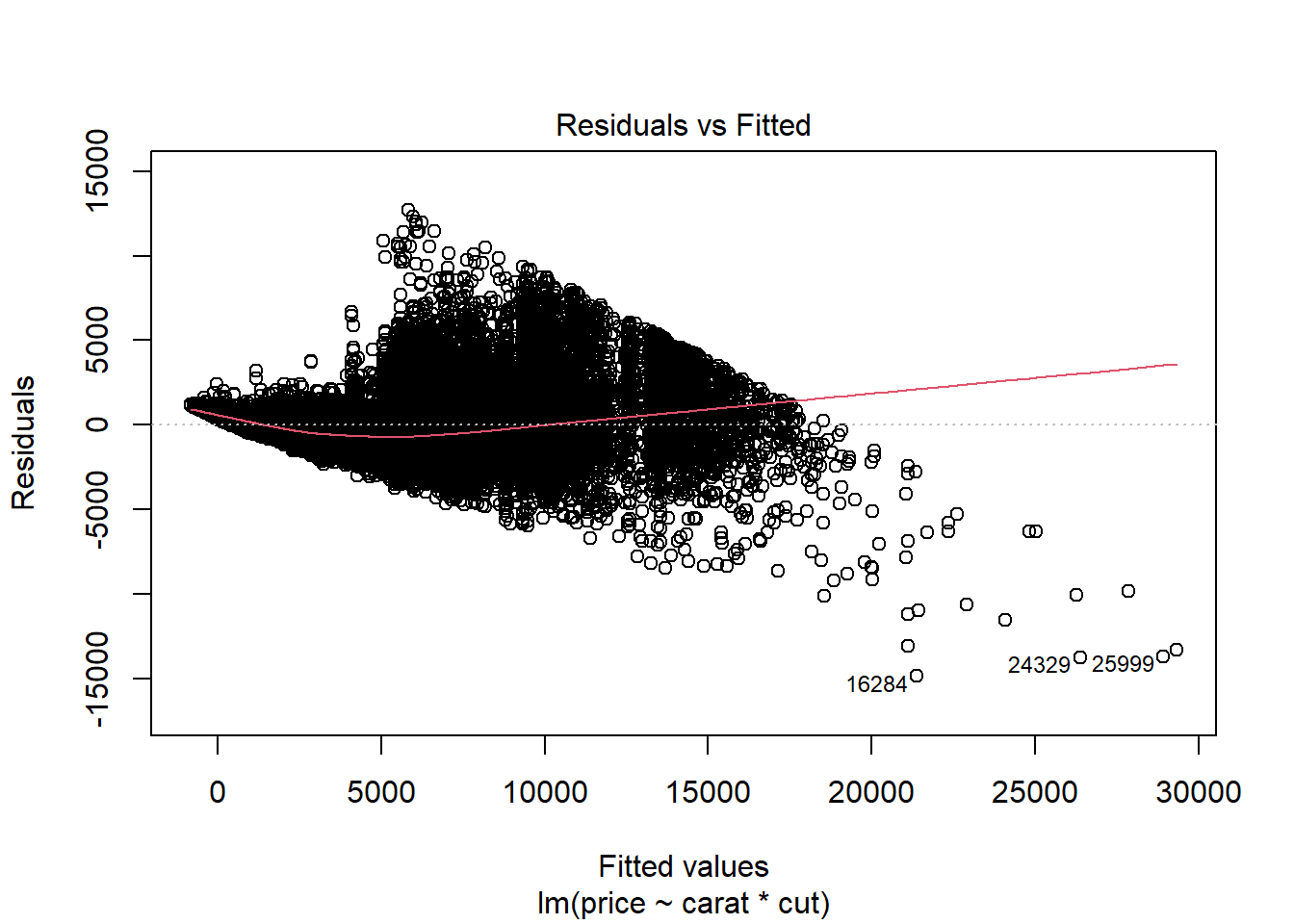 \[ \widehat{price} = b_0 + b_1(\text{carat}) + b_2(\text{cut}) + b_3(\text{carat} \times \text{cut}) \]