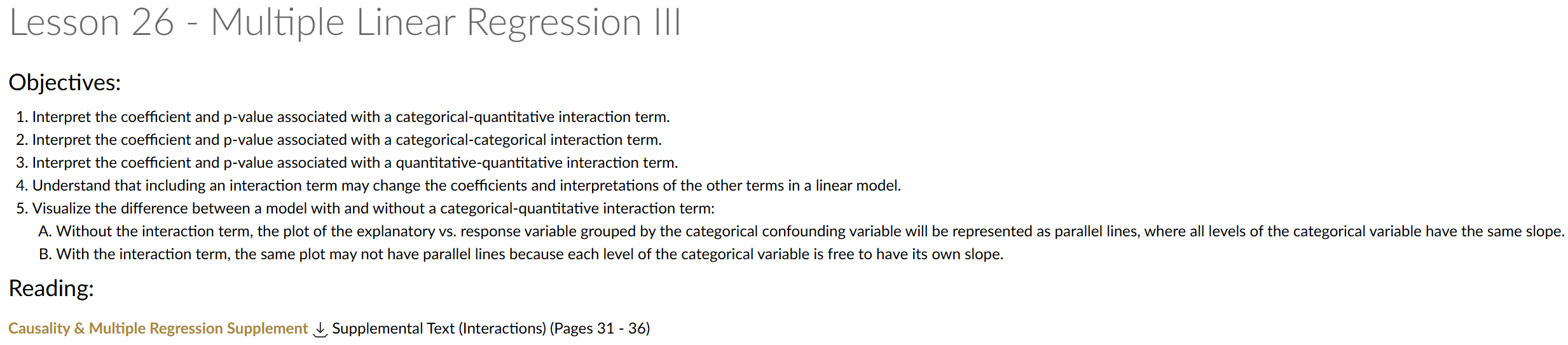 \[ \widehat{price} = b_0 + b_1(\text{carat}) + b_2(\text{cut}) + b_3(\text{carat} \times \text{cut}) \]