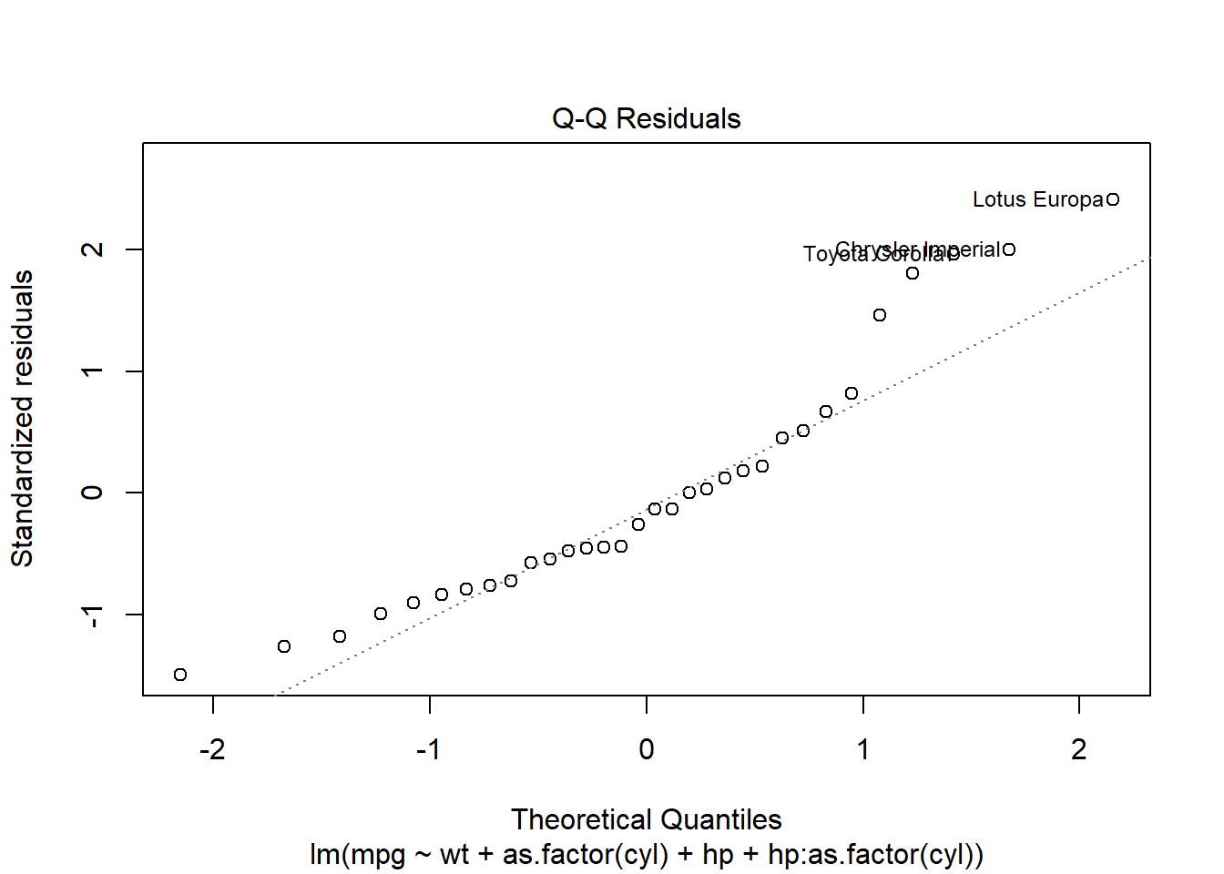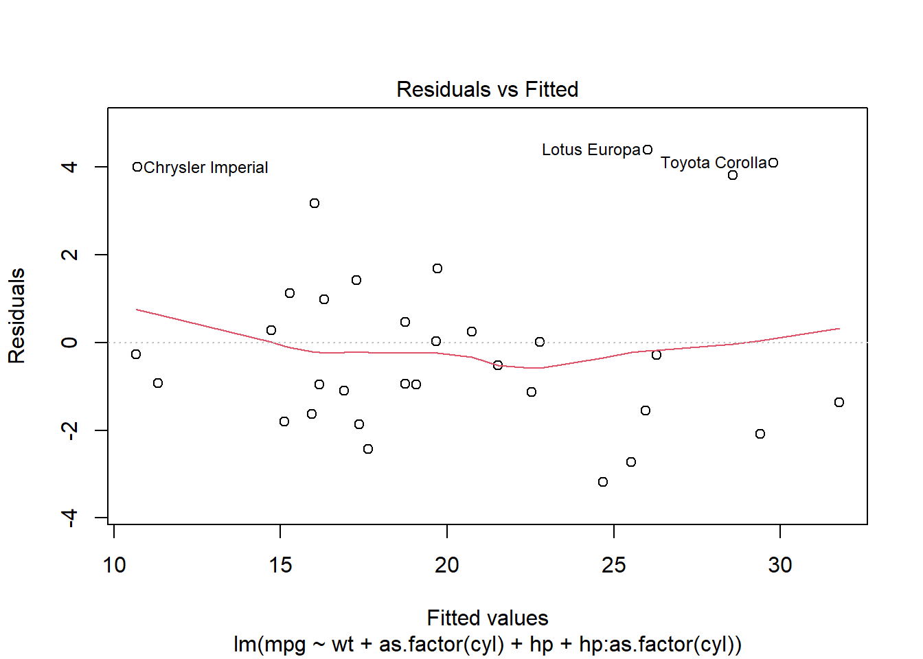lm(formula = mpg ~ wt + as.factor(cyl) + hp + hp:as.factor(cyl),