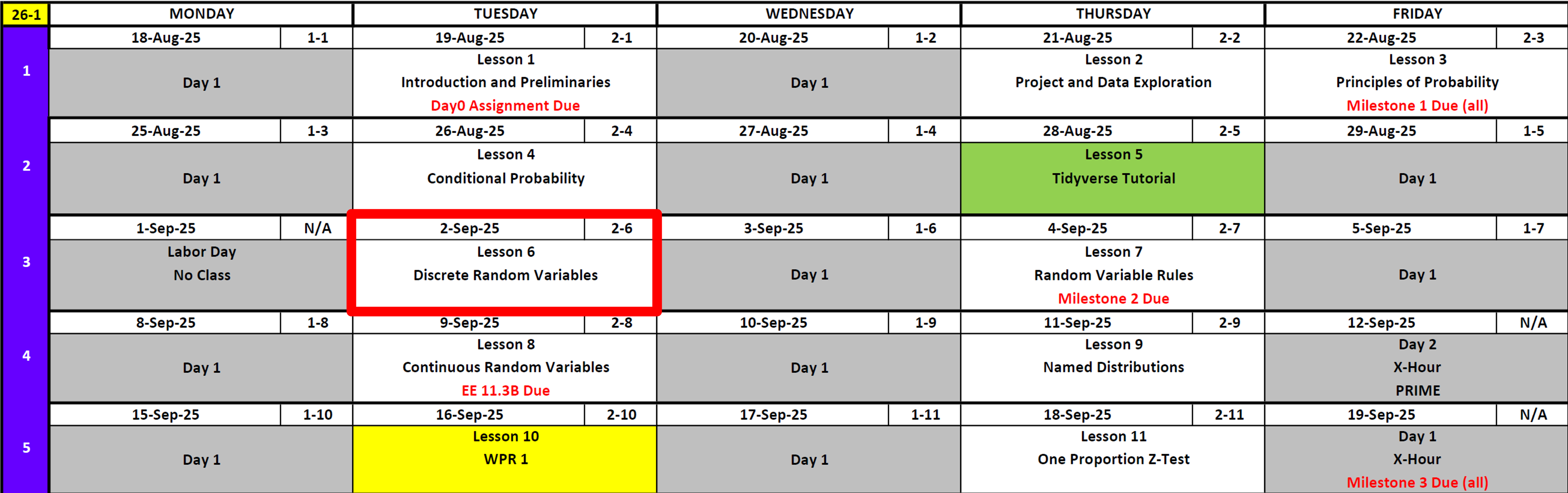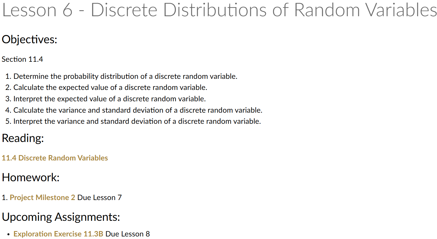 The variance of a discrete random variable measures the average squared deviation from its mean: \[ \mathrm{Var}(X)=\sum_x (x-\mu_X)^2\,P(X=x) \] and the standard deviation is \[ \mathrm{SD}(X)=\sqrt{\mathrm{Var}(X)}. \]