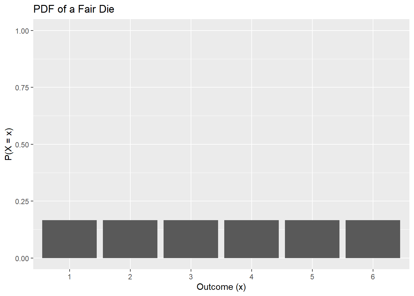 | \(P(X=x)\) | \(1/6\) | \(1/6\) | \(1/6\) | \(1/6\) | \(1/6\) | \(1/6\) |