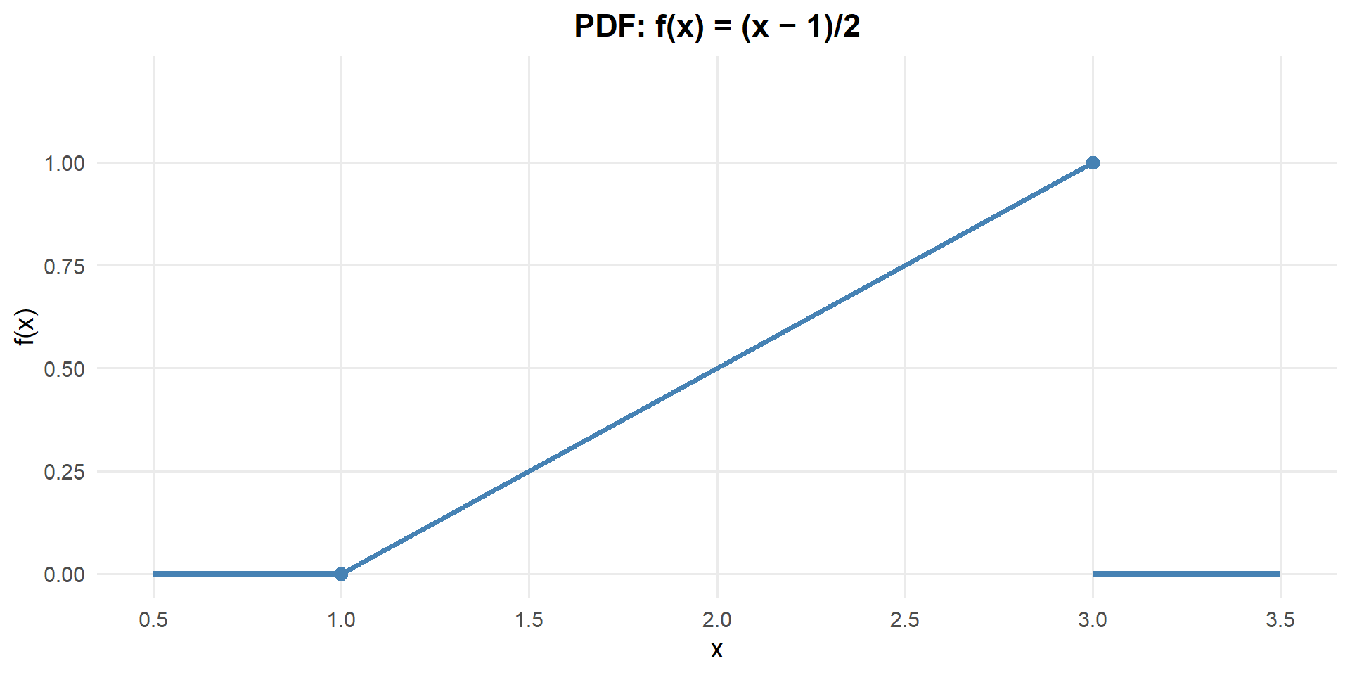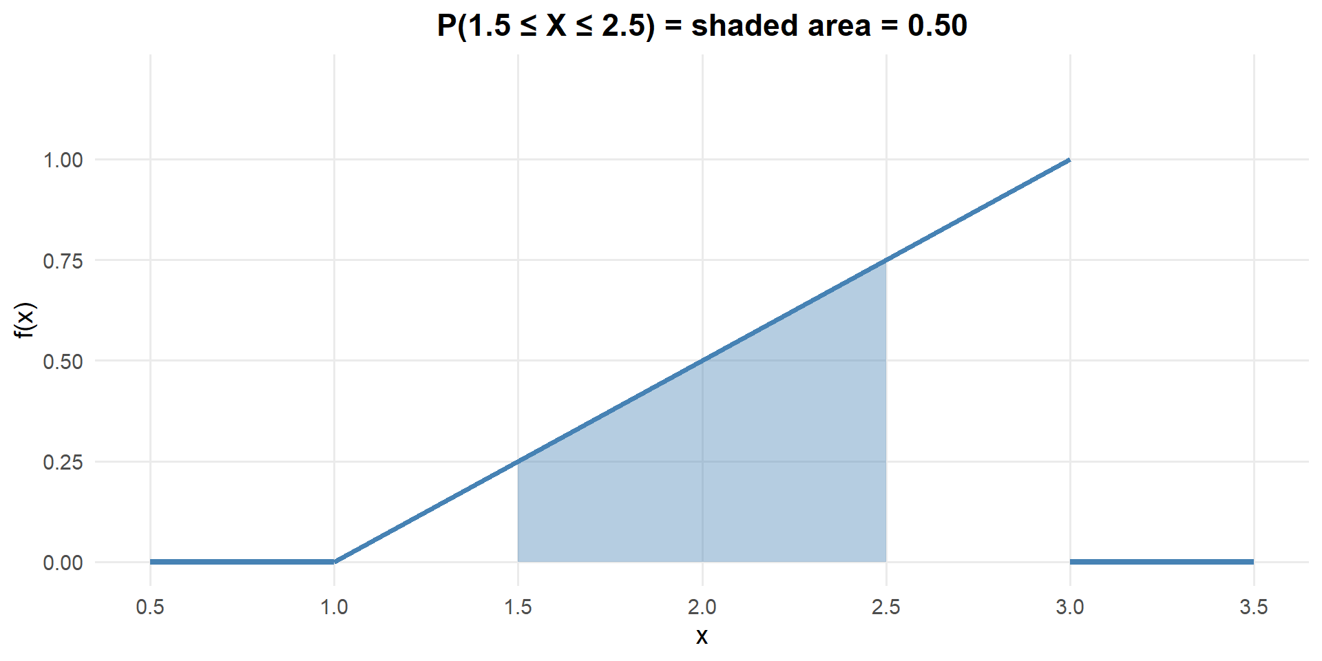 \(P(1 \leq X \leq 3) = \int_1^3 \frac{1}{4}\,dx = \frac{2}{4} = 0.50\)