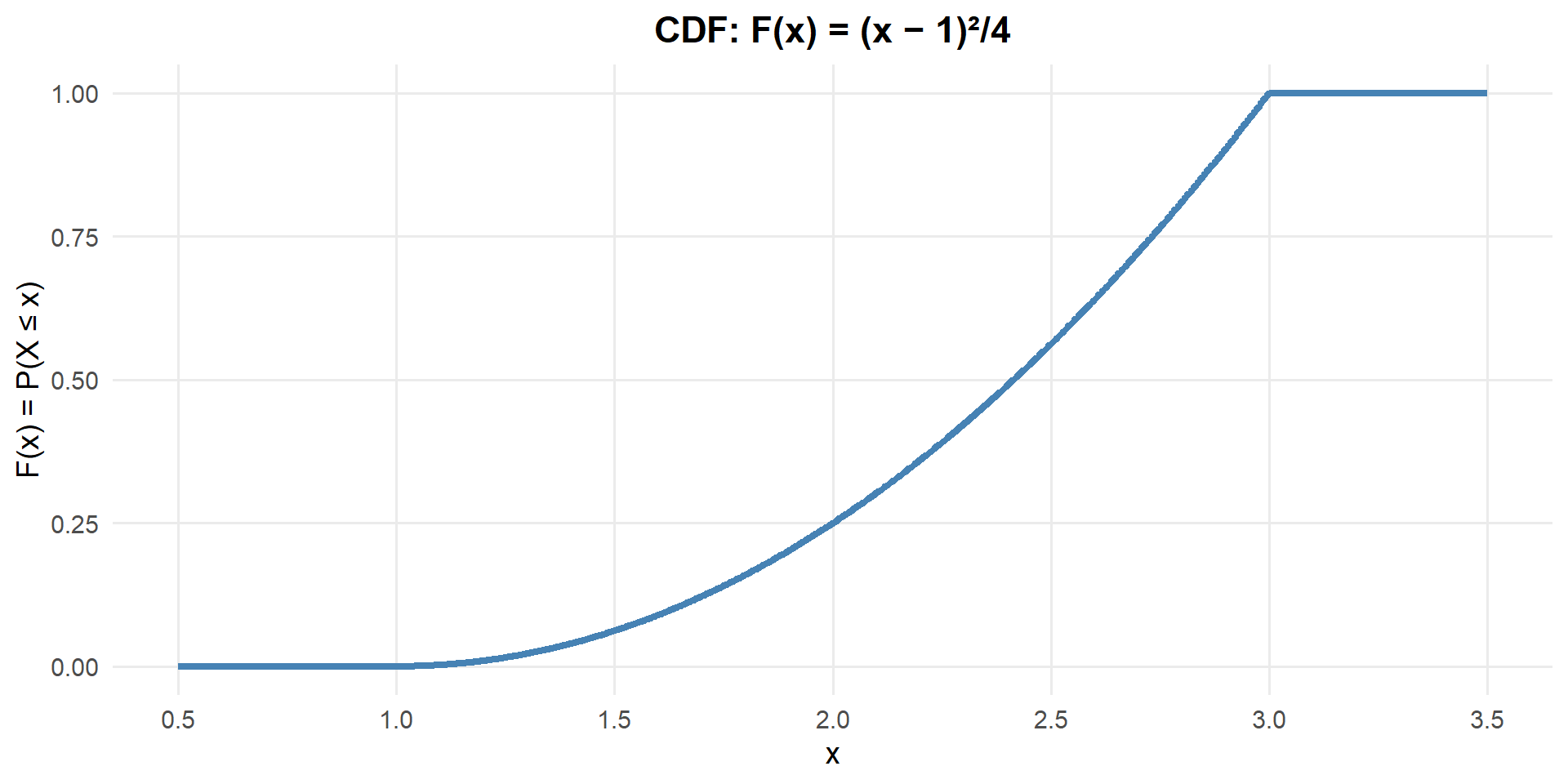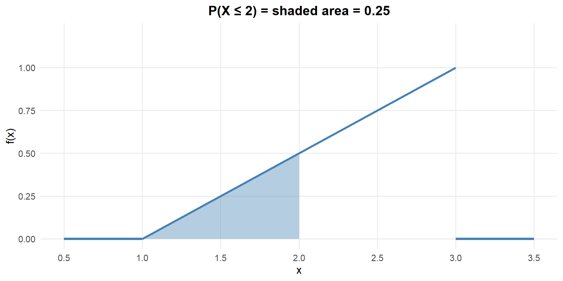 \(P(X \leq 1) = \int_0^1 \frac{1}{4}\,dx = \frac{1}{4} = 0.25\)