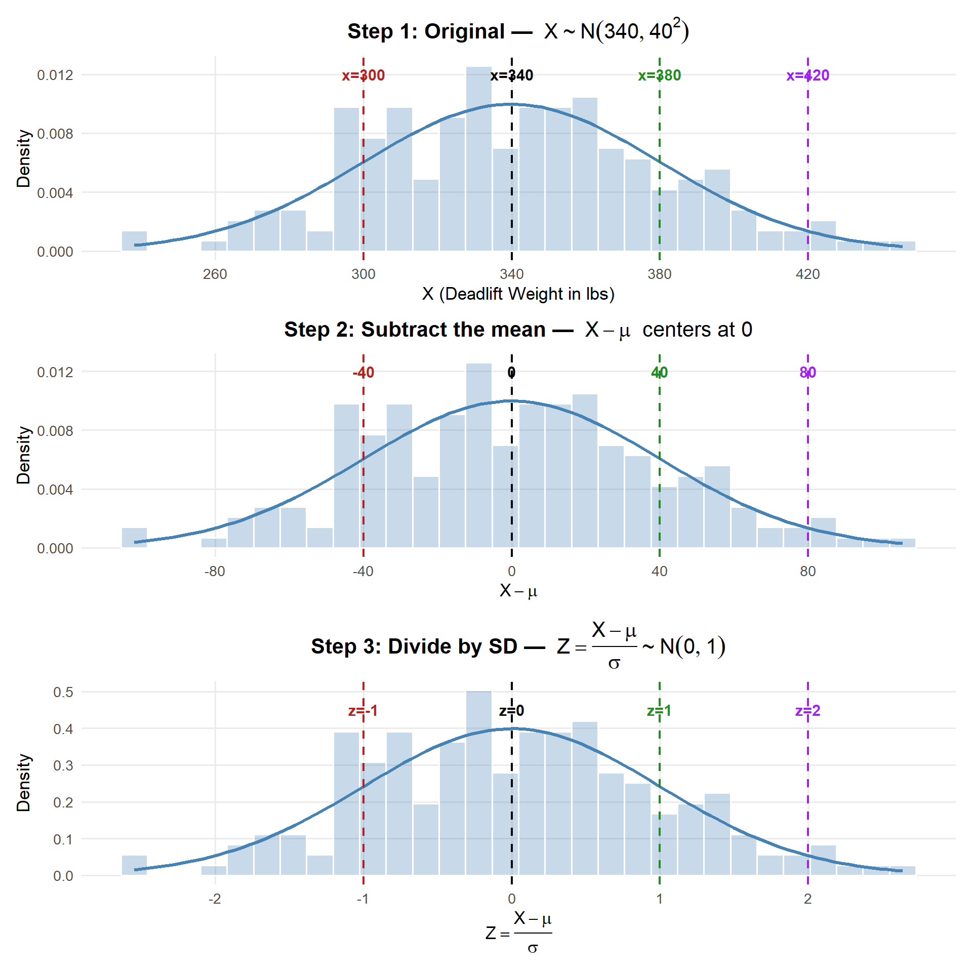 Unstandardization: Convert back: \[X = \mu + Z\sigma\]
