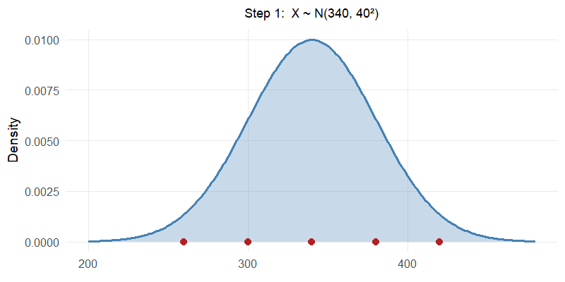 Recall the PDF: \(f(x) = \frac{1}{\sigma\sqrt{2\pi}} e^{-\frac{(x-\mu)^2}{2\sigma^2}}\) with \(\mu = 340, \sigma = 40\)