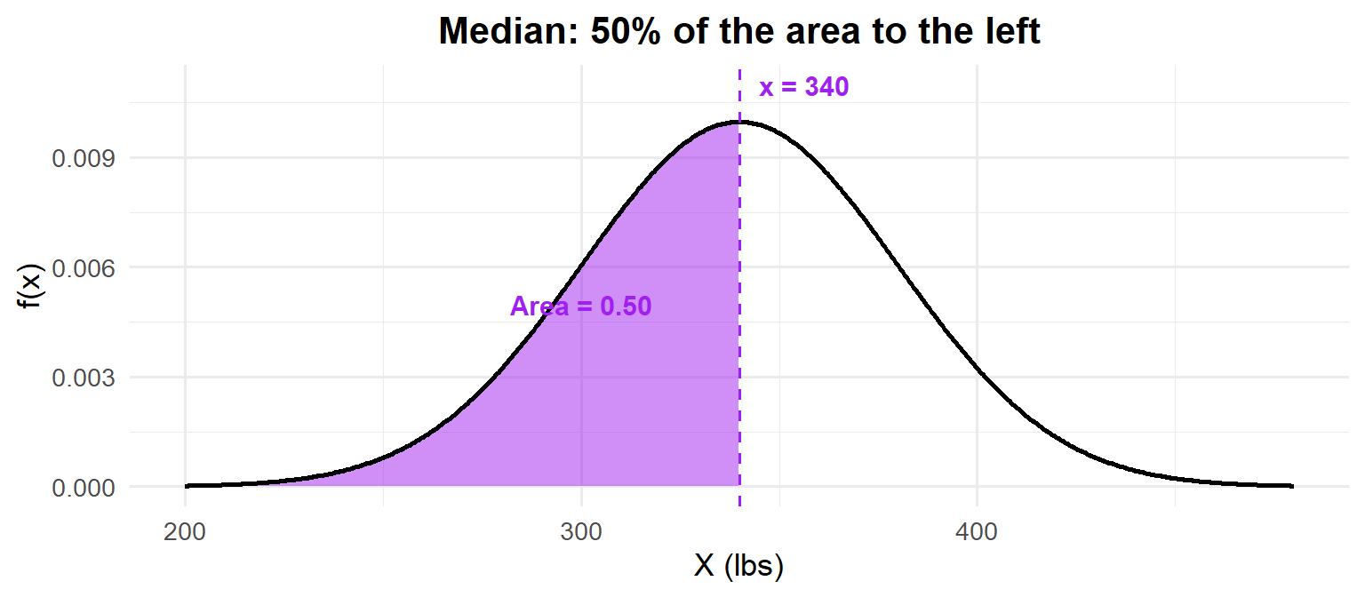 What is the median deadlift? The median is the 50th percentile: \(P(X \leq x) = 0.50\).