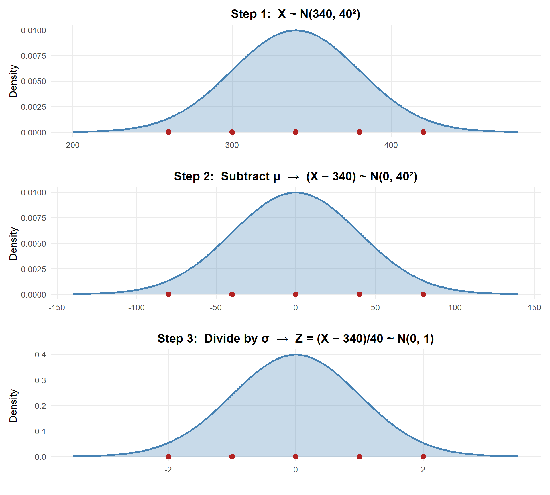 Any normal random variable can be converted to the standard normal \(Z \sim N(0,1)\). This lets us use a single Z table to compute probabilities for any normal distribution.