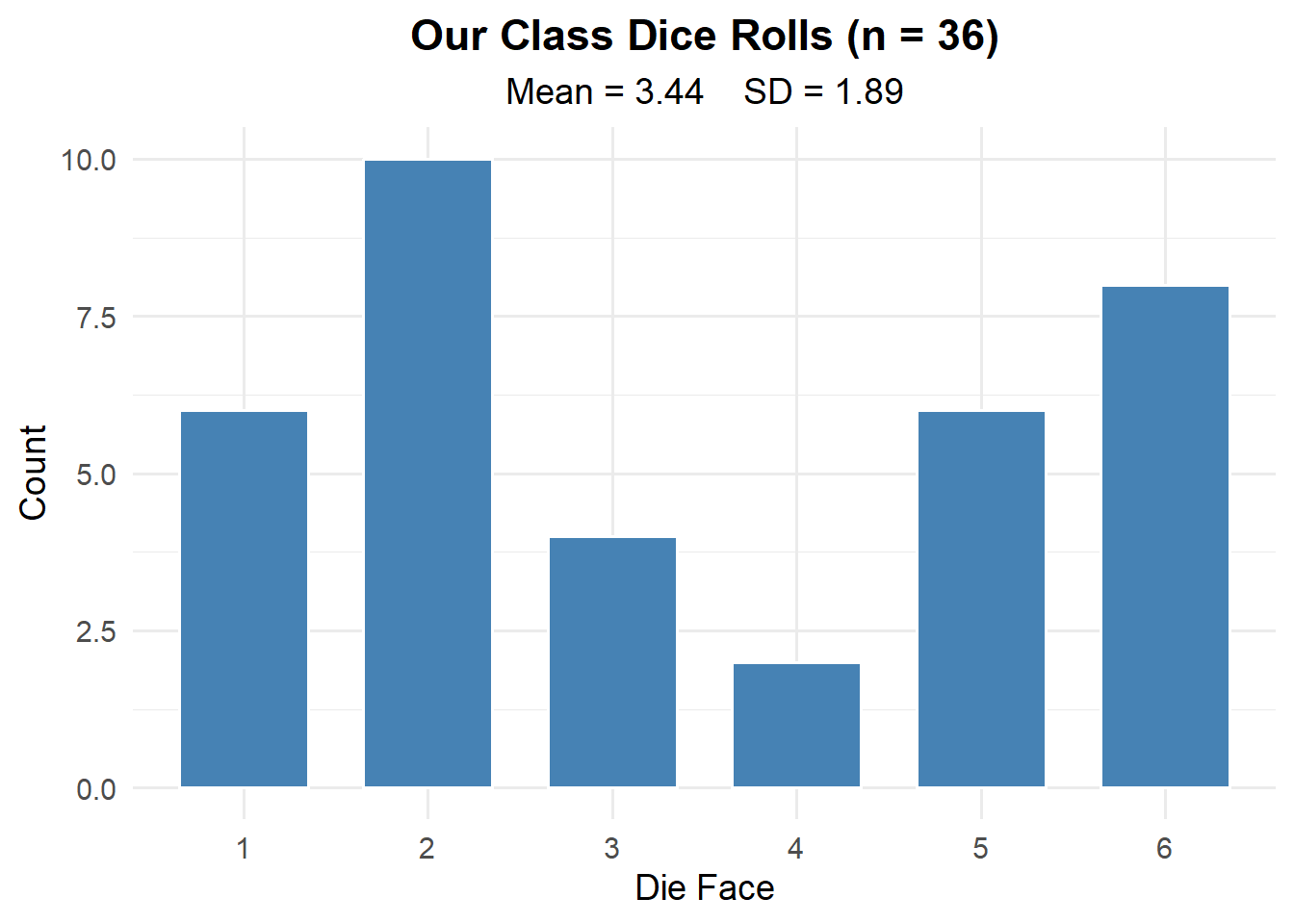 Each individual roll is uniform — but the average of 36 rolls follows a bell curve. That’s the Central Limit Theorem.