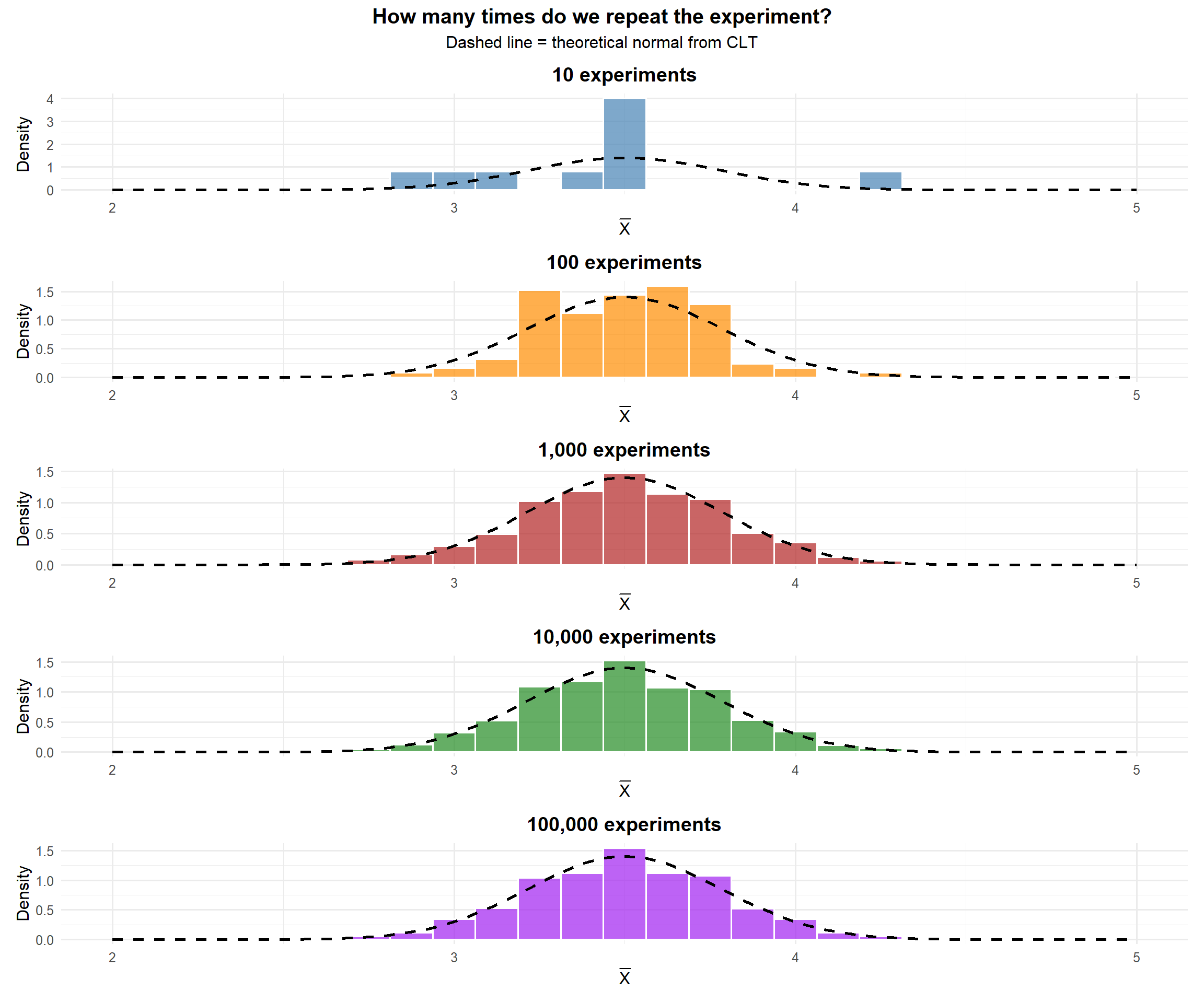 theme(plot.title = element_text(hjust = 0.5, face = "bold"))But what do we notice about the shape as we repeat the experiment more and more?