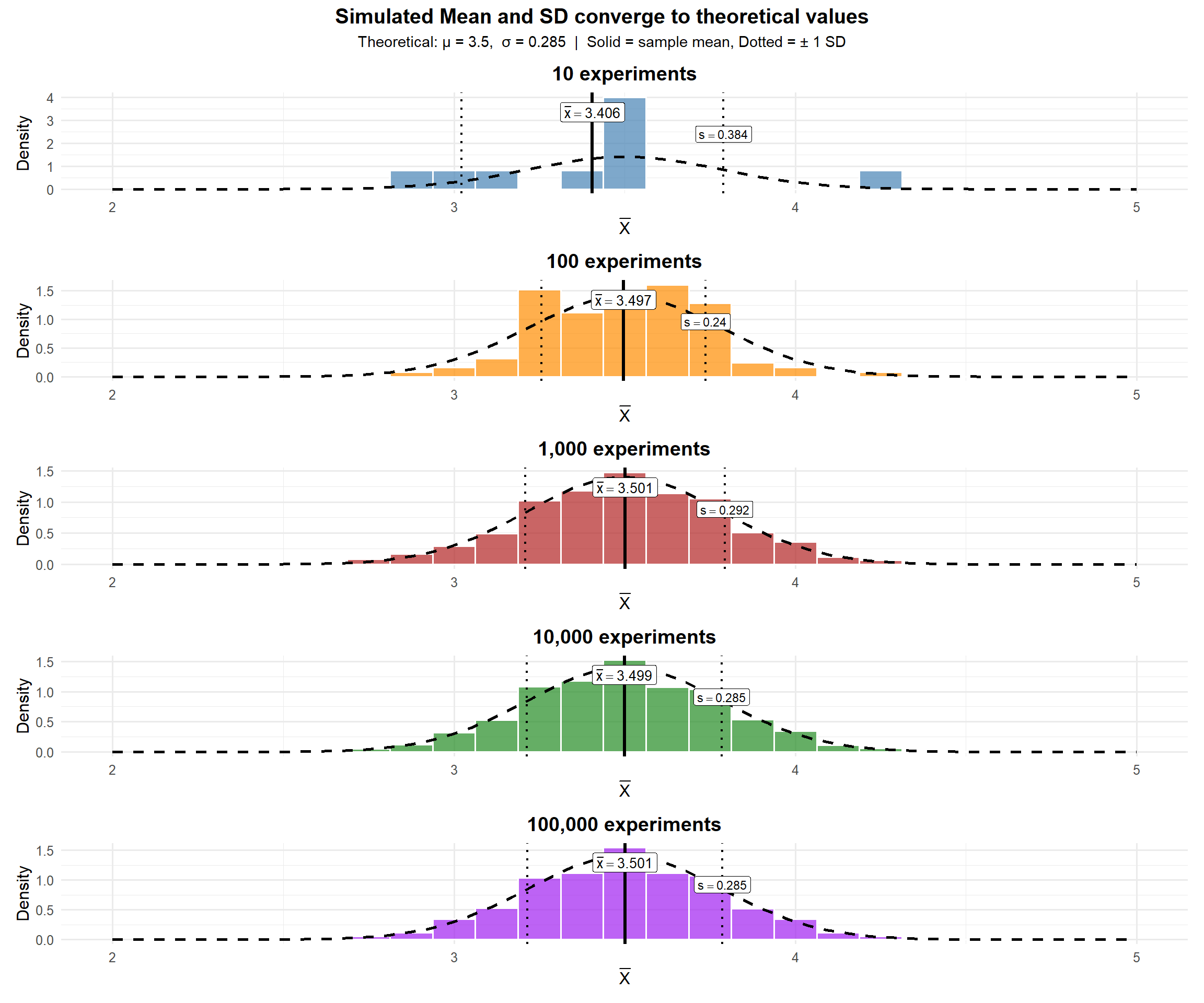 From the plots above, the mean of \(\bar{X}\) converges to 3.5 — the mean of the underlying distribution (a fair die). And the standard deviation of \(\bar{X}\) converges to the standard deviation of the underlying distribution divided by \(\sqrt{n}\).