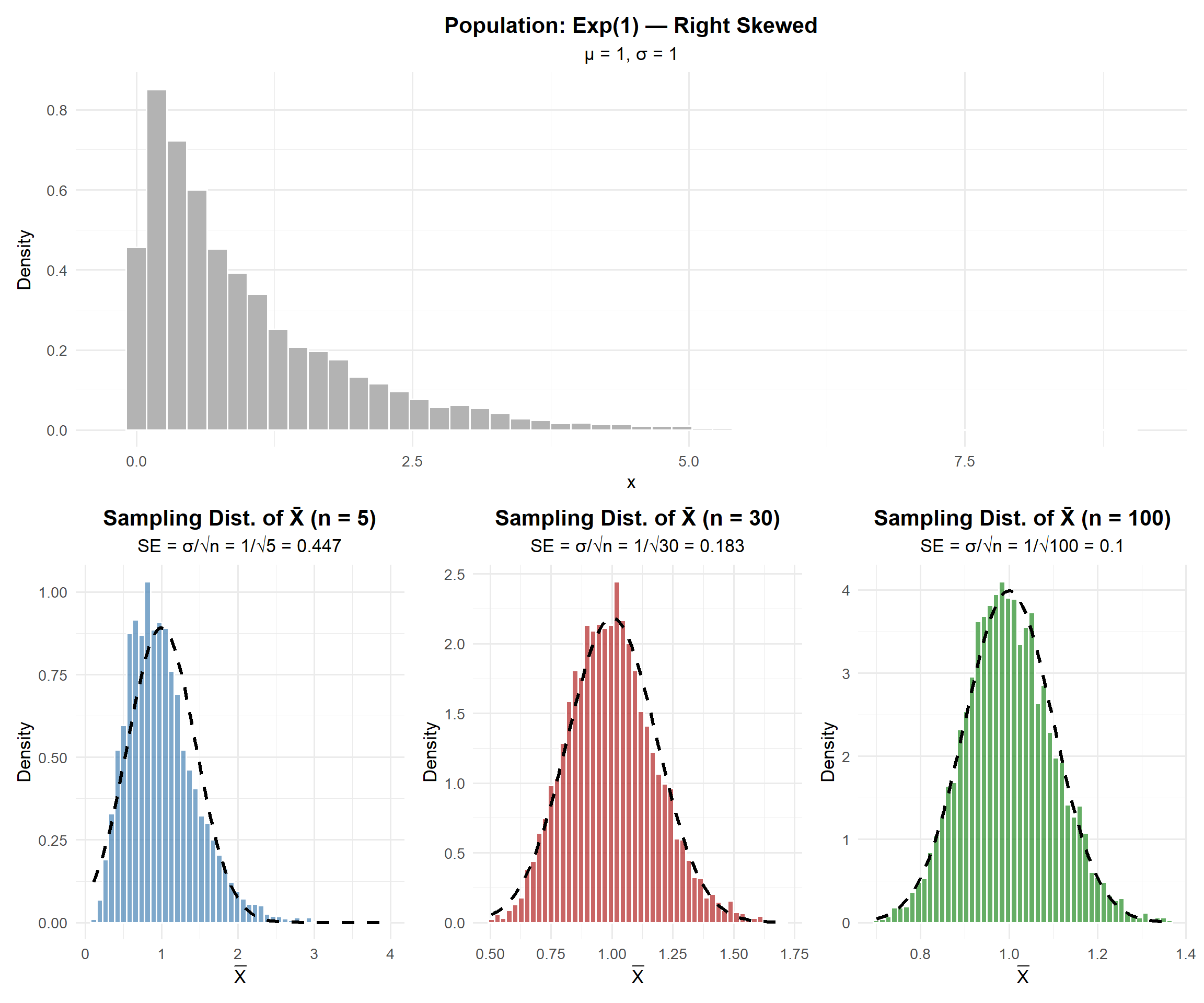 - The population is right-skewed (exponential), but the sampling distribution of \(\bar{X}\) becomes more normal as \(n\) increases