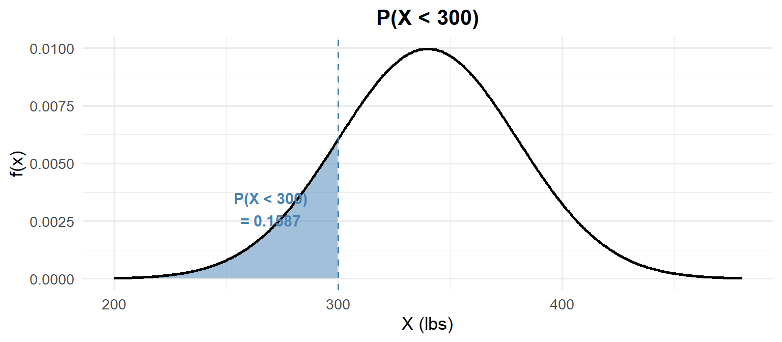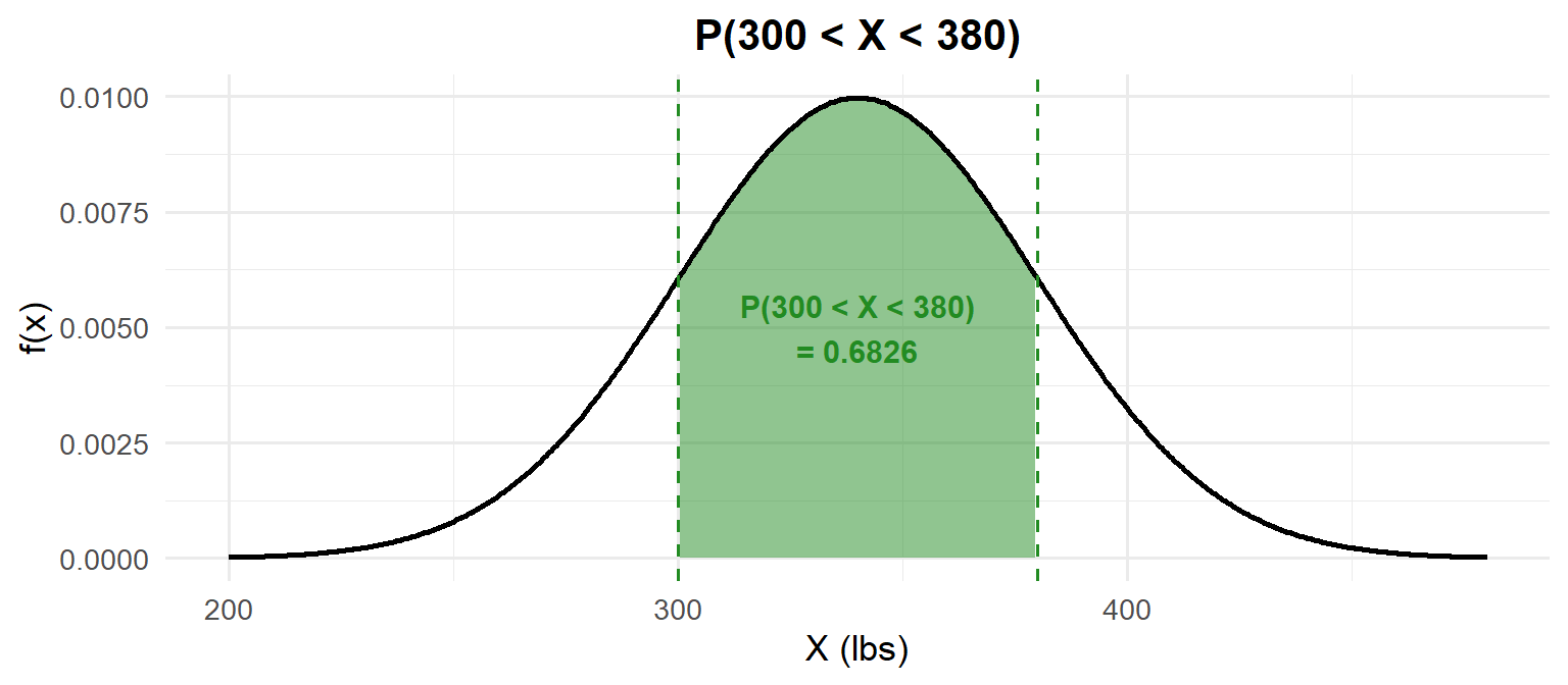 Suppose \(X \sim N(340, 40^2)\) (cadet deadlift weights in lbs).