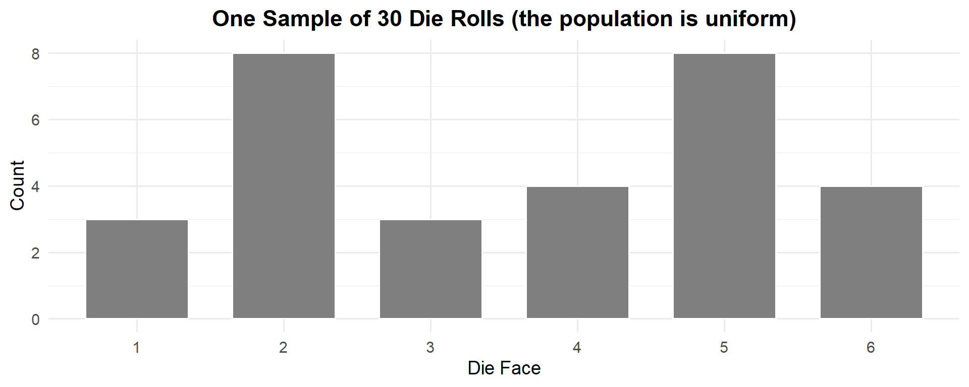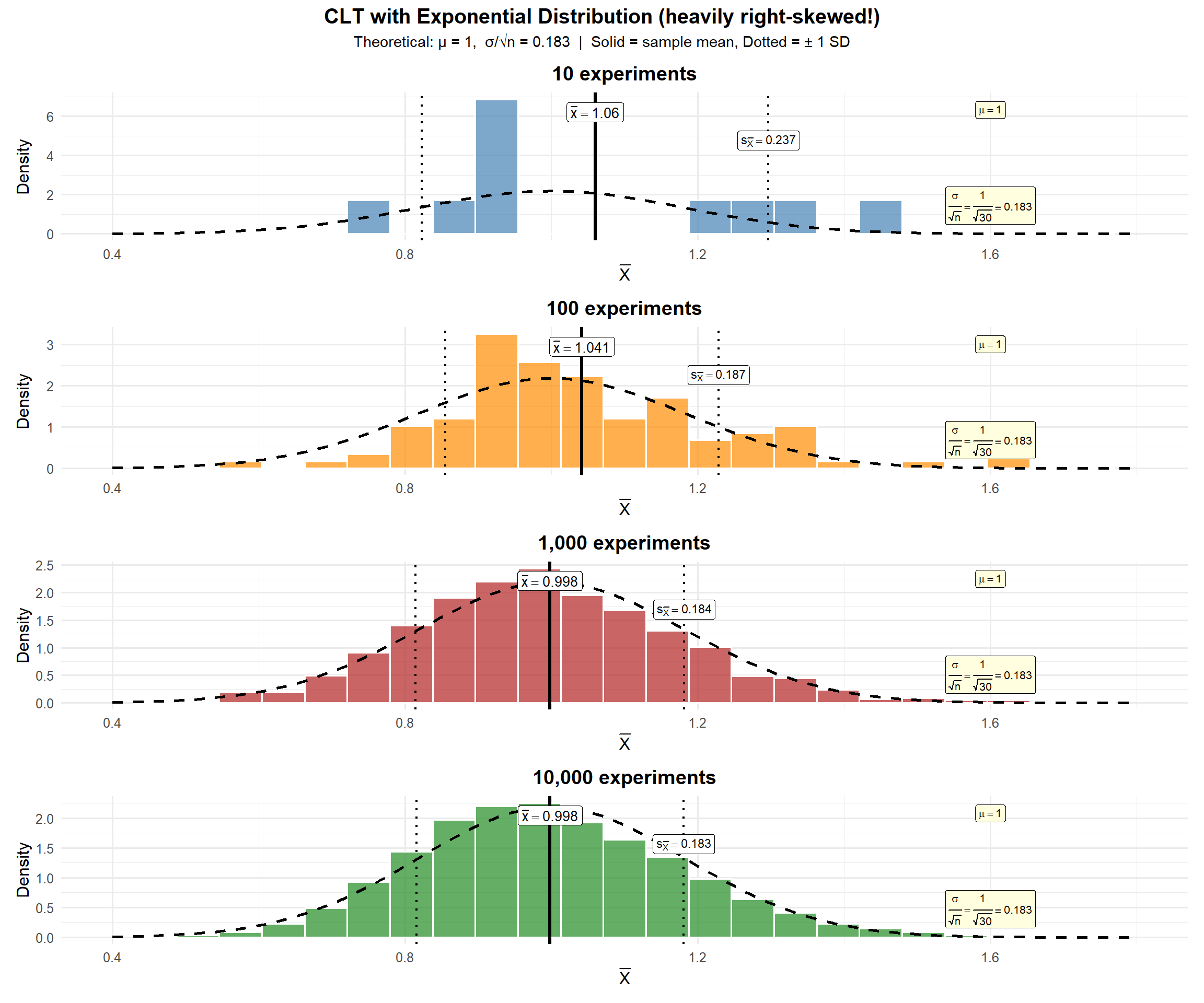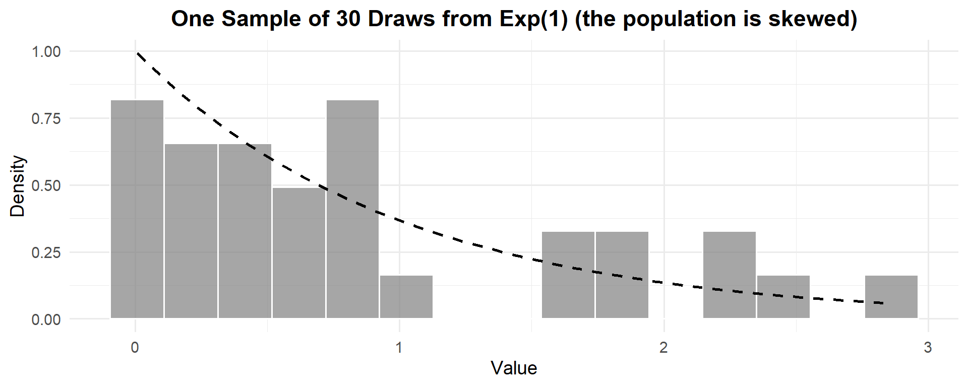 This is one experiment — one sample of \(n = 30\) draws from \(\text{Exp}(1)\). Clearly not normal — it’s heavily right-skewed. The theoretical mean is \(\mu = 1\) and the theoretical standard deviation is \(\sigma = 1\).