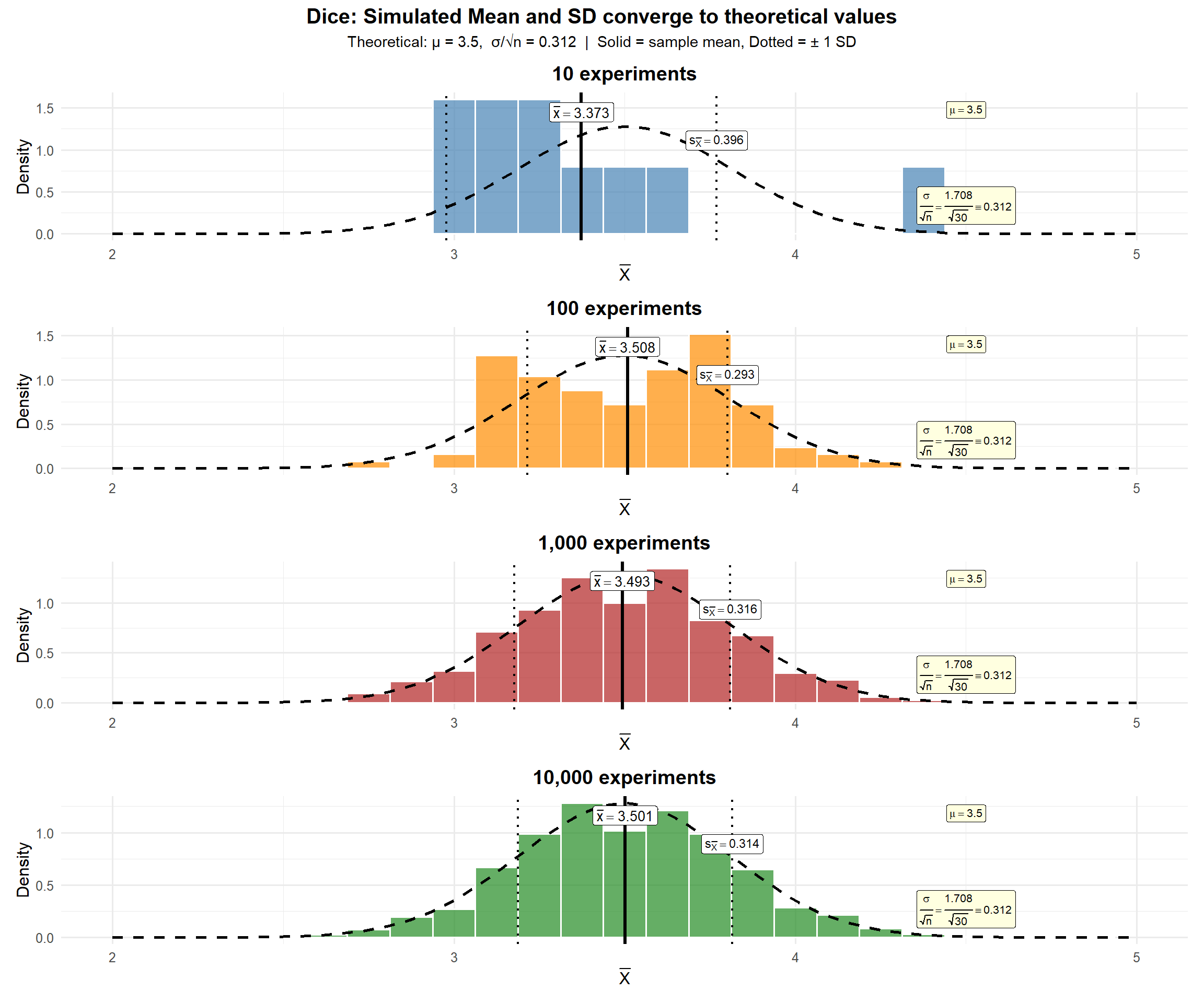 The SD shown (\(s \approx 0.312\)) is not the SD of a single die roll (\(\sigma = 1.708\)). It’s the SD of the sample means — i.e., \(\frac{\sigma}{\sqrt{n}} = \frac{1.708}{\sqrt{30}} = 0.312\).