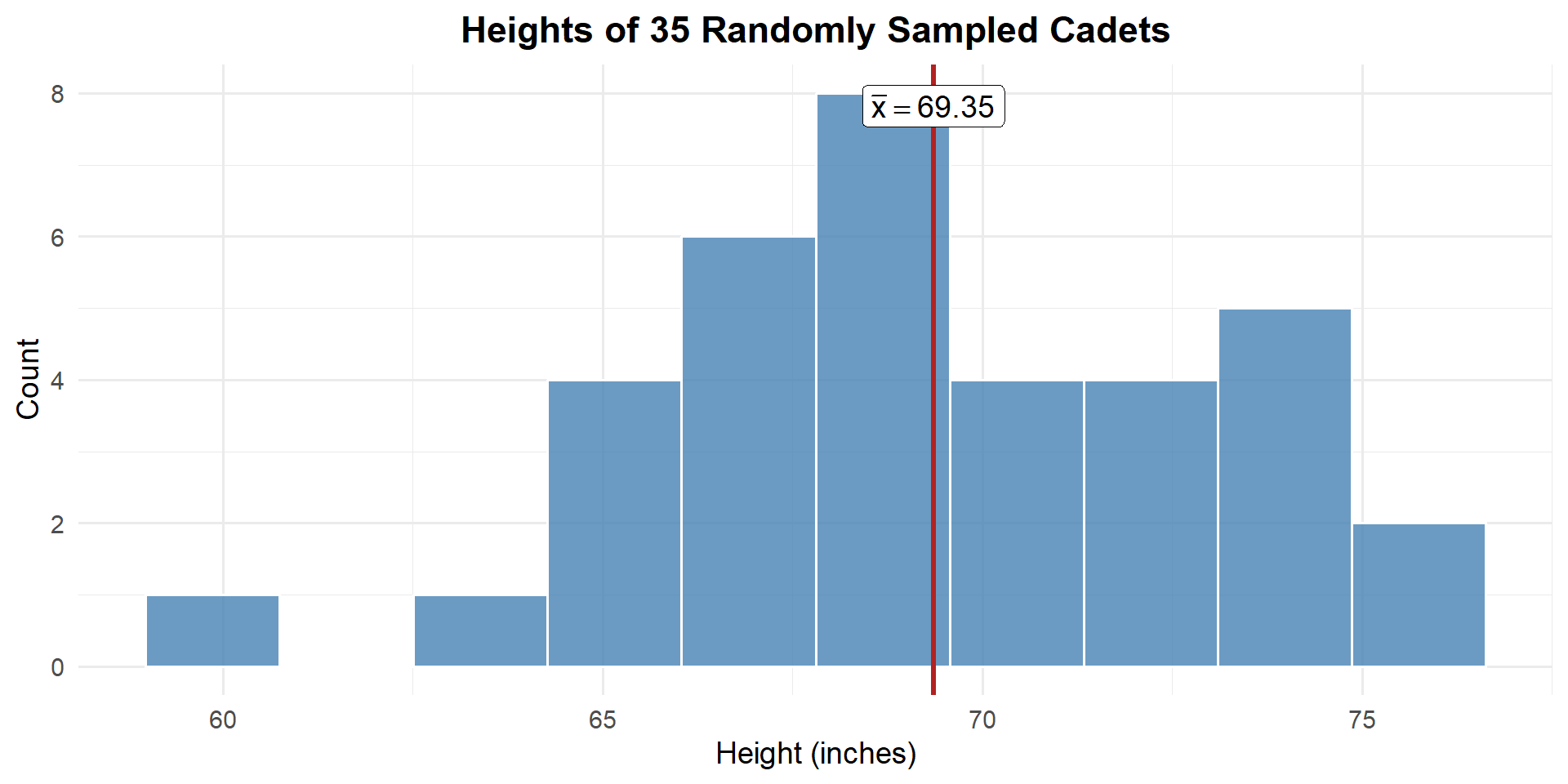 Suppose we want to know the true average height of all cadets at West Point. We can’t measure every cadet, so we take a random sample of \(n = 35\) cadets and measure their heights (in inches).