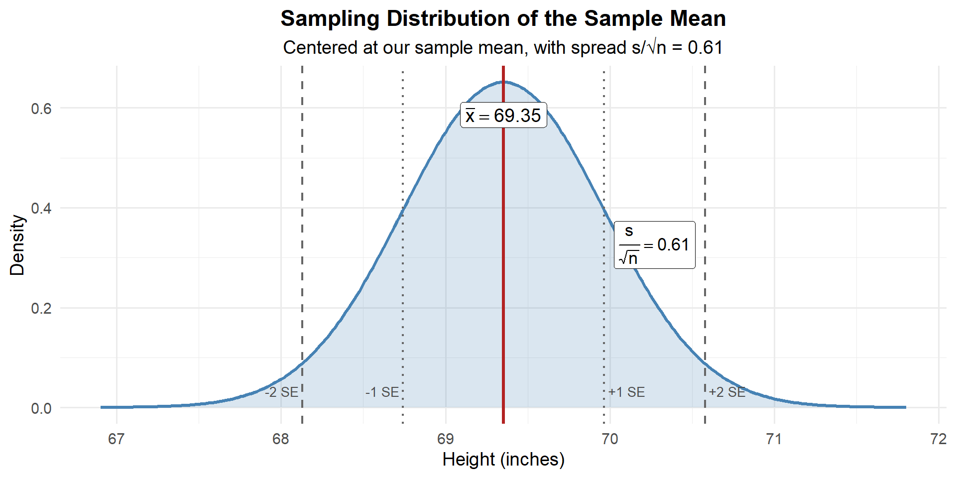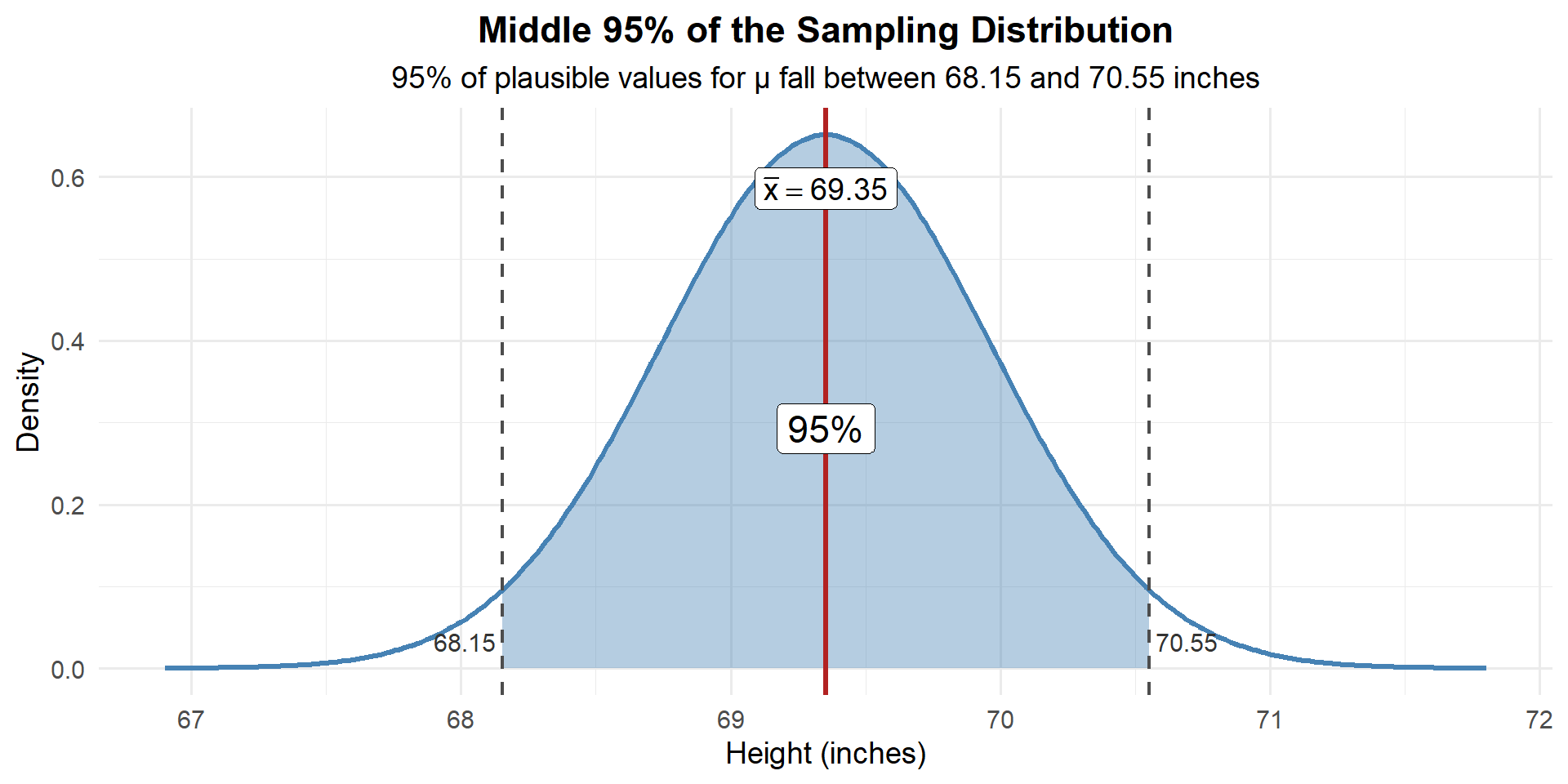 We have a point estimate of the true mean: \(\bar{x} = 69.35\) inches. But how good is that estimate?