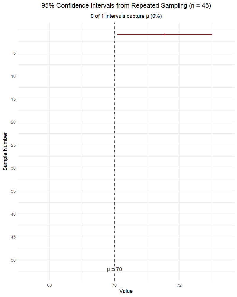 The \(z\)-interval is narrower — but that’s not a good thing! With only 6 observations, \(s\) is an unreliable estimate of \(\sigma\). The \(z\)-interval ignores this extra uncertainty, making it overconfident. It claims 95% confidence but its actual coverage rate is less than 95%. The \(t\)-interval honestly accounts for our uncertainty.