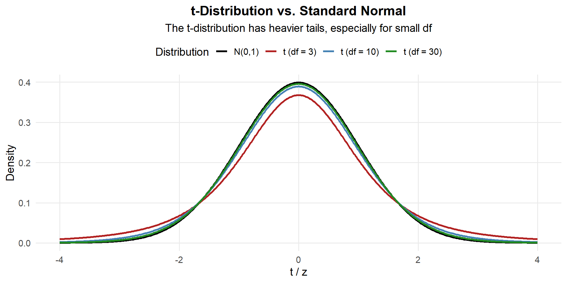- Heavier tails than the normal → wider intervals for small samples