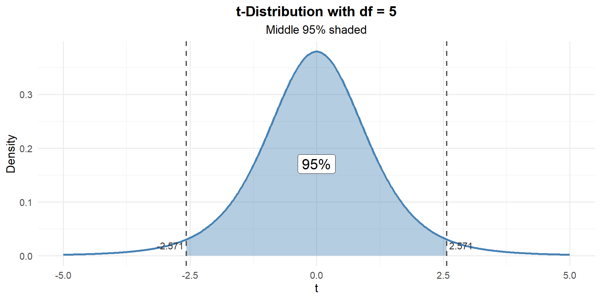 qt(0.975, df = 5) # upper critical value[1] 2.570582
