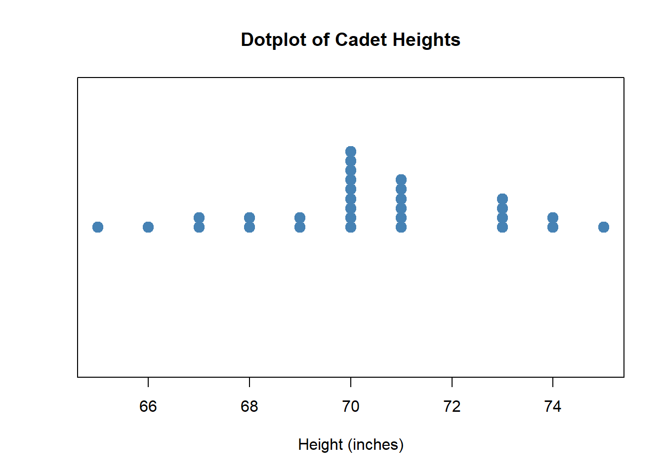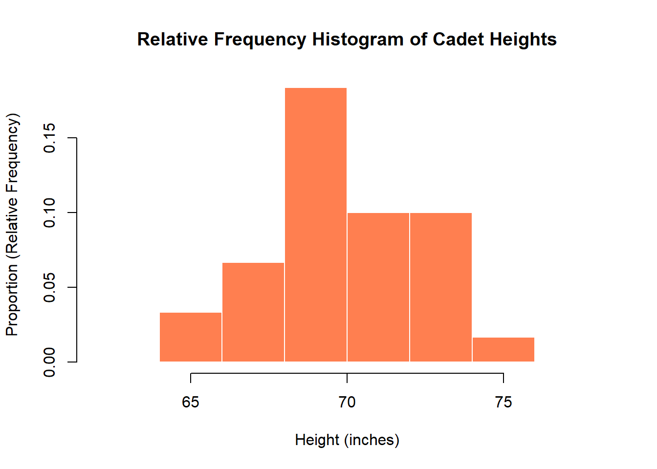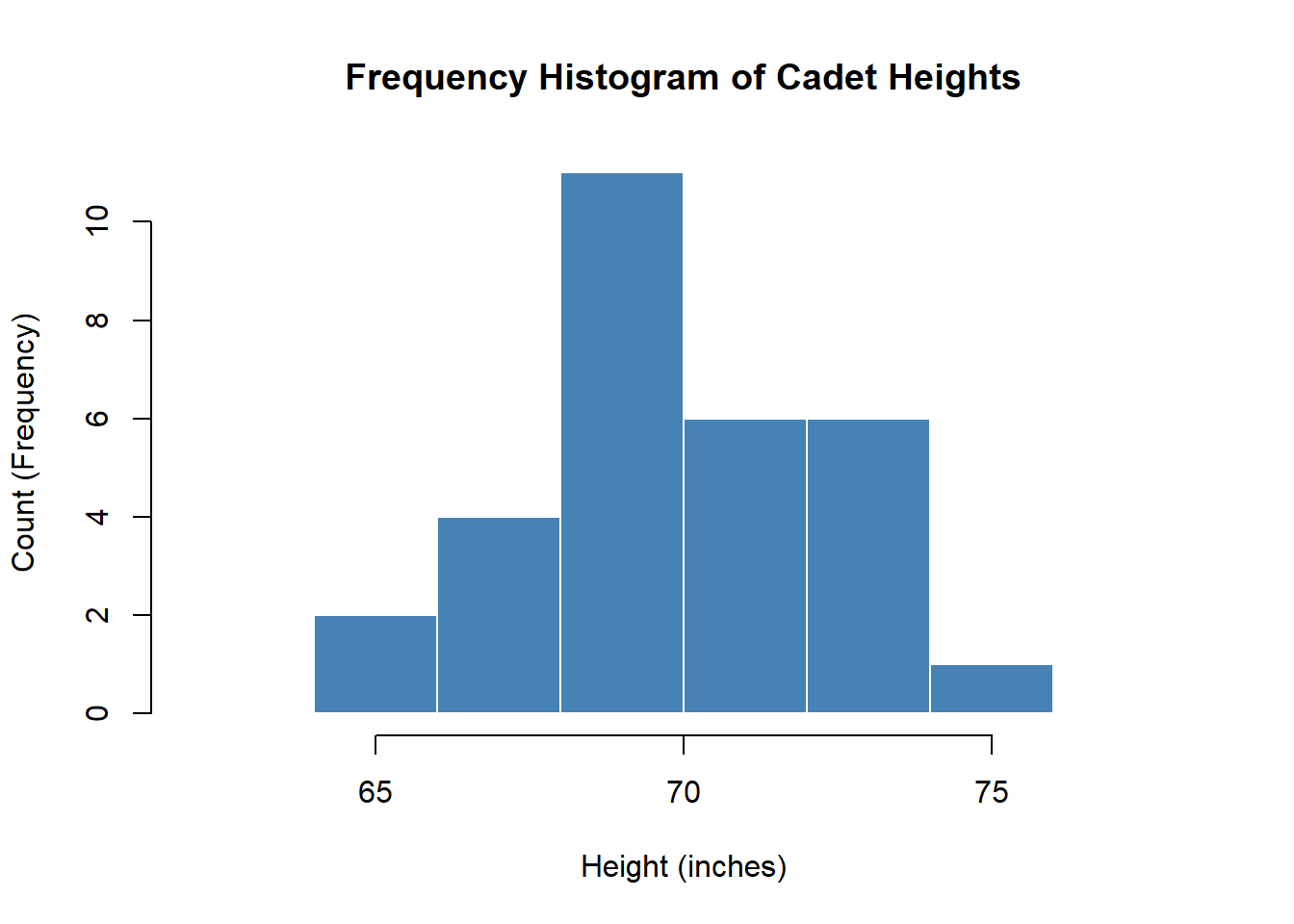 Unique advantage: Shows proportions - we can say “about 50% of cadets are between 70-72 inches tall.” Essential for comparing groups of different sizes (e.g., comparing this section of 30 to another section of 18).