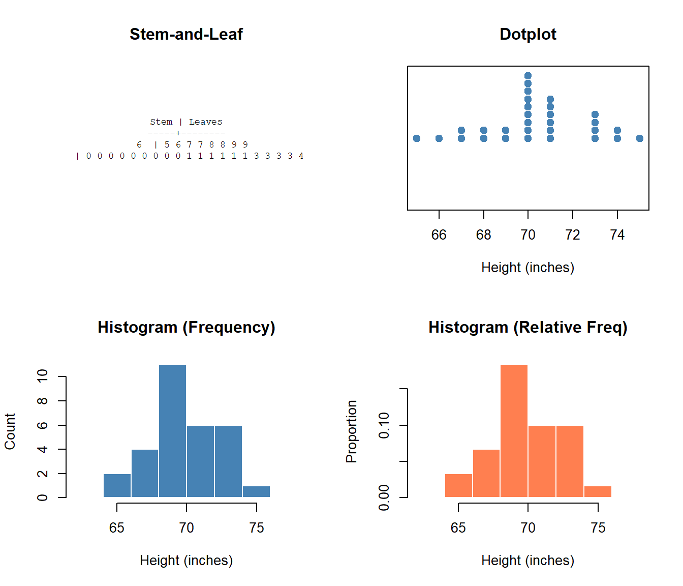 Let’s use simulated height data for 30 cadets to demonstrate all four display types.