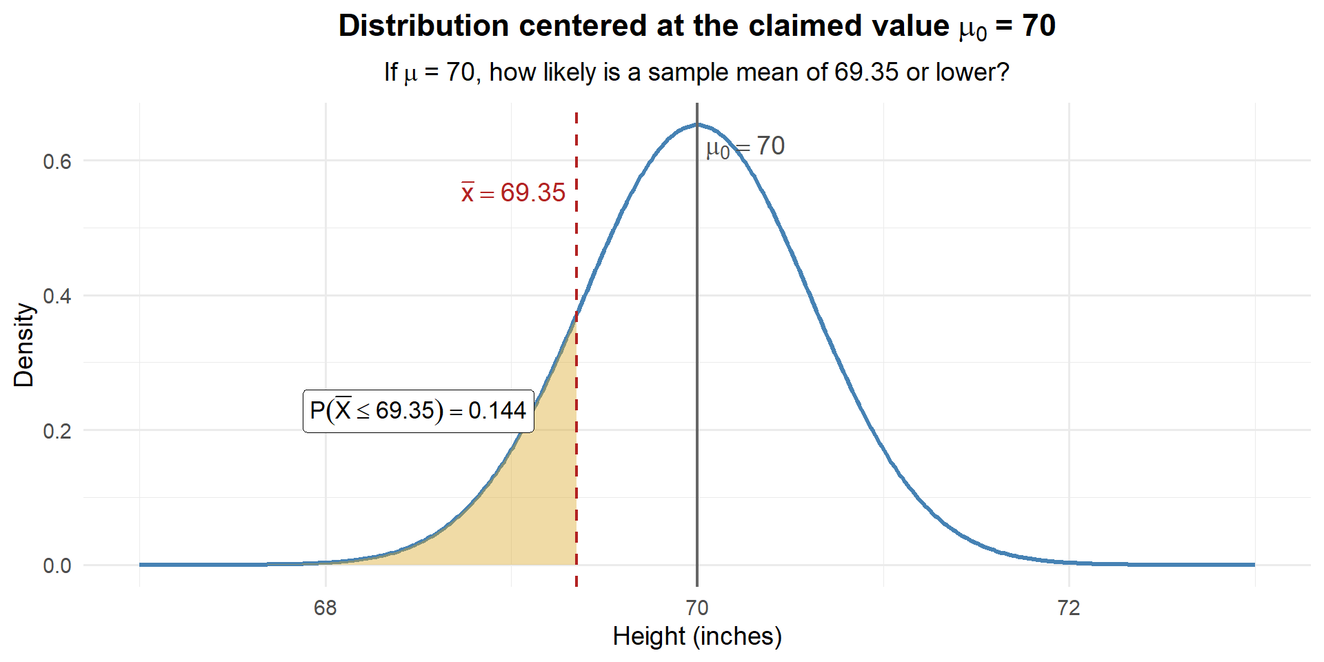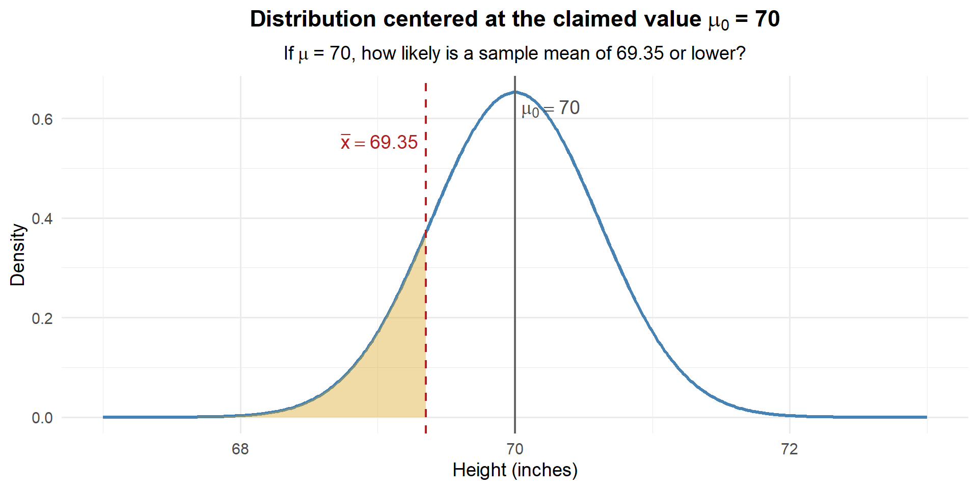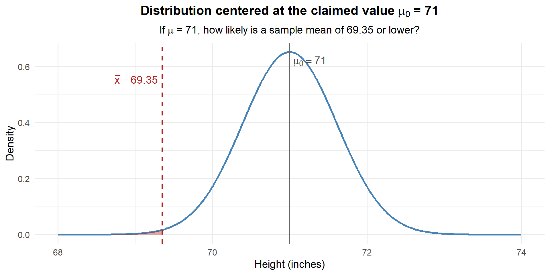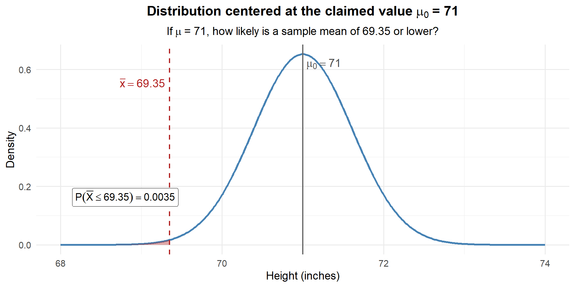 Only about 0.35% chance. If the true mean were really 71, we would almost never see a sample mean as low as 69.35. Our data is way out in the left tail of this distribution. We have strong evidence that the true mean is less than 71 inches.