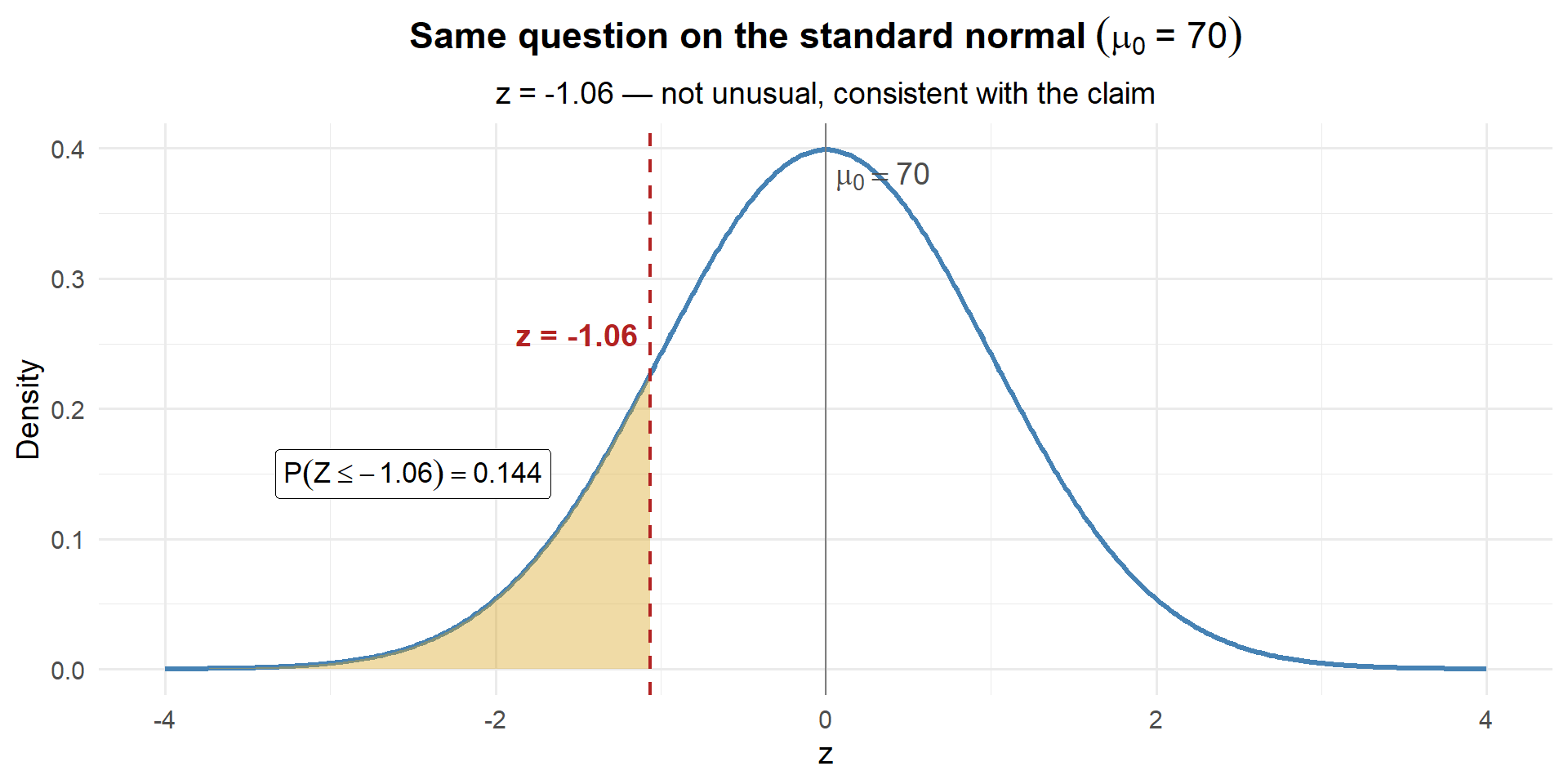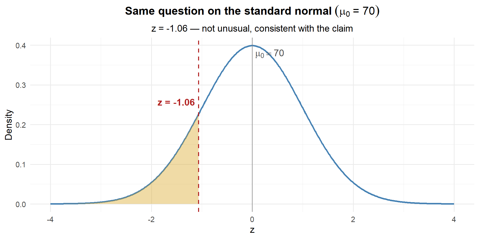 About 14.4% of the time, we’d see a sample mean this low or lower if \(\mu\) really were 70. That’s not unusual at all — our data are perfectly consistent with \(\mu = 70\).
