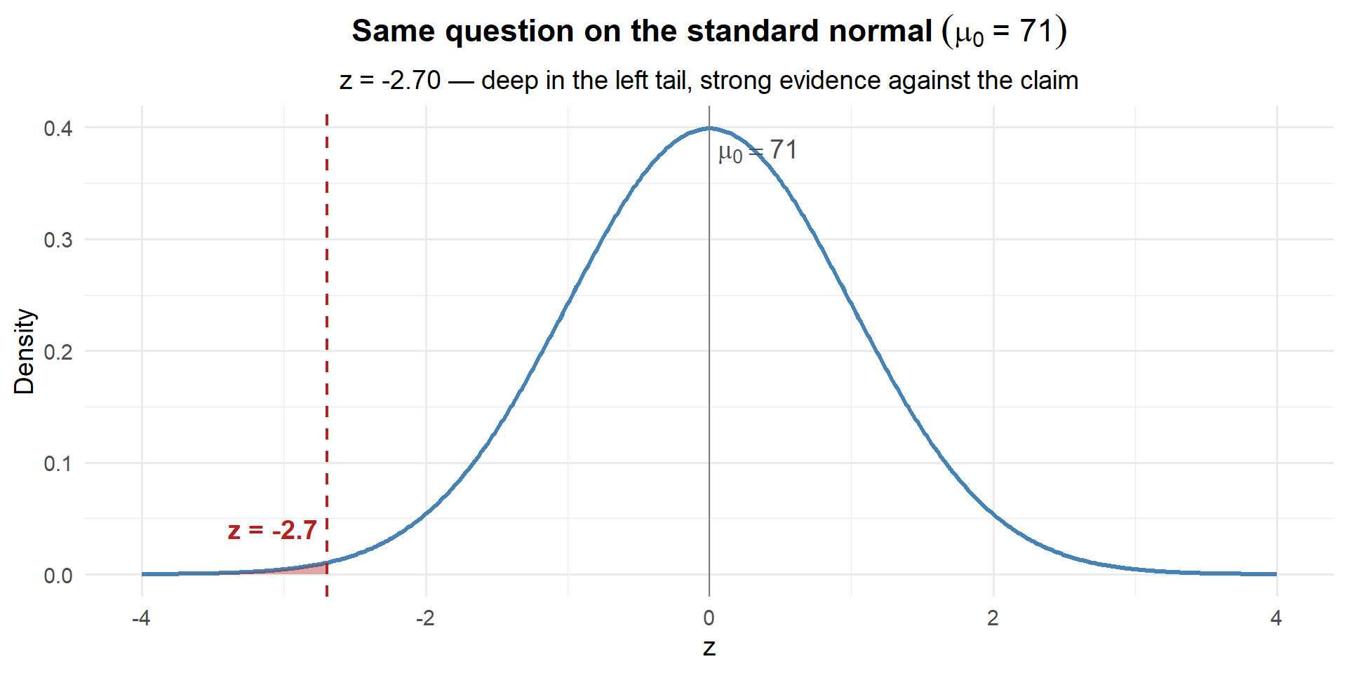 - Instant intuition: \(z = -2.70\) immediately tells you “2.7 standard errors below the claim” without knowing anything else about the problem
