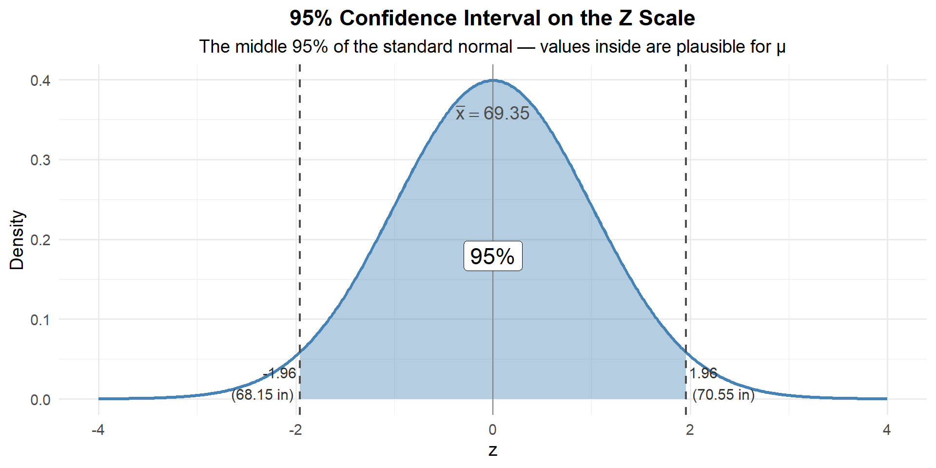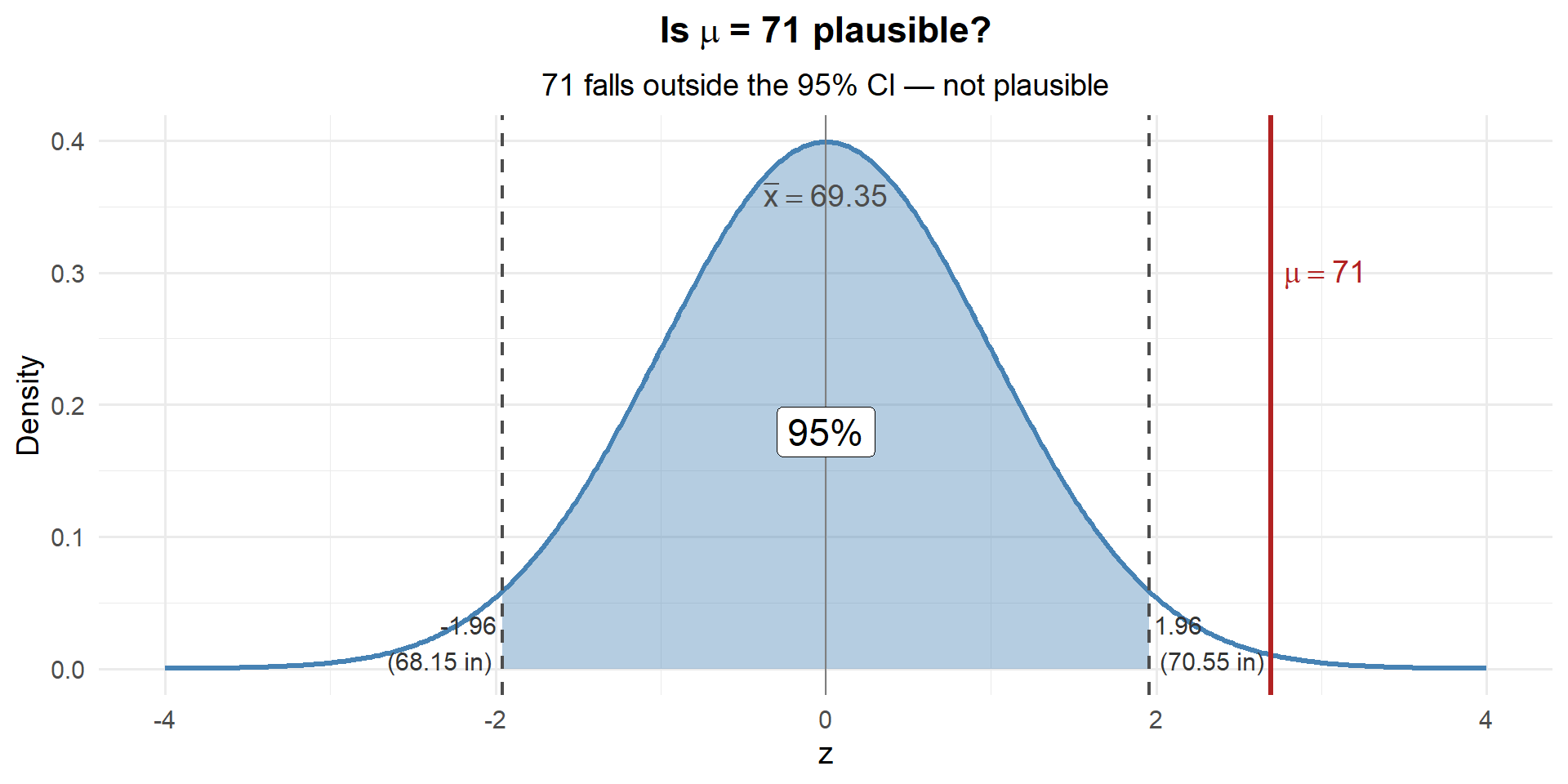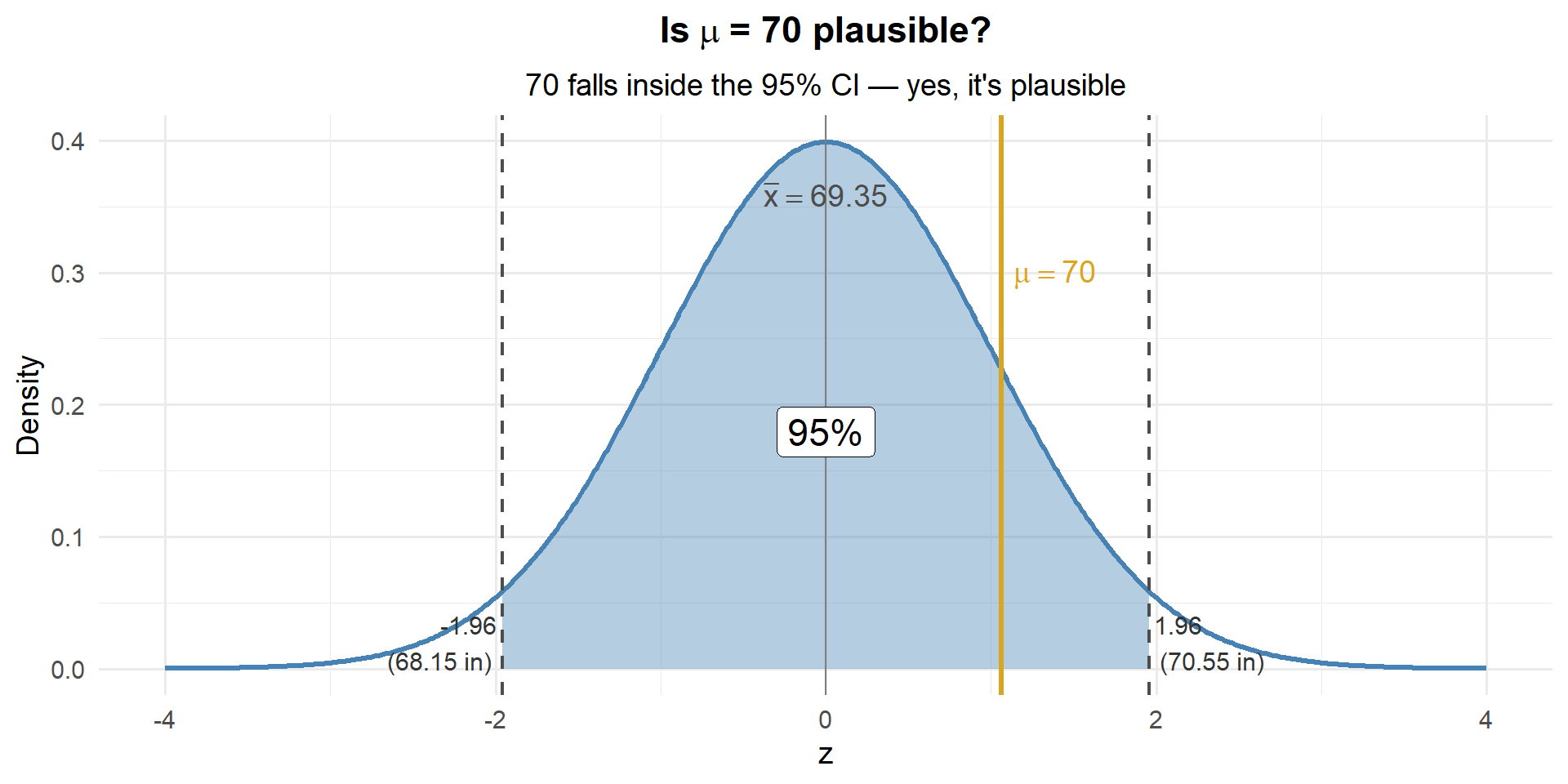 Well, 70 falls inside our 95% CI of \((68.15, 70.55)\). So yes — 70 is a plausible value for \(\mu\).