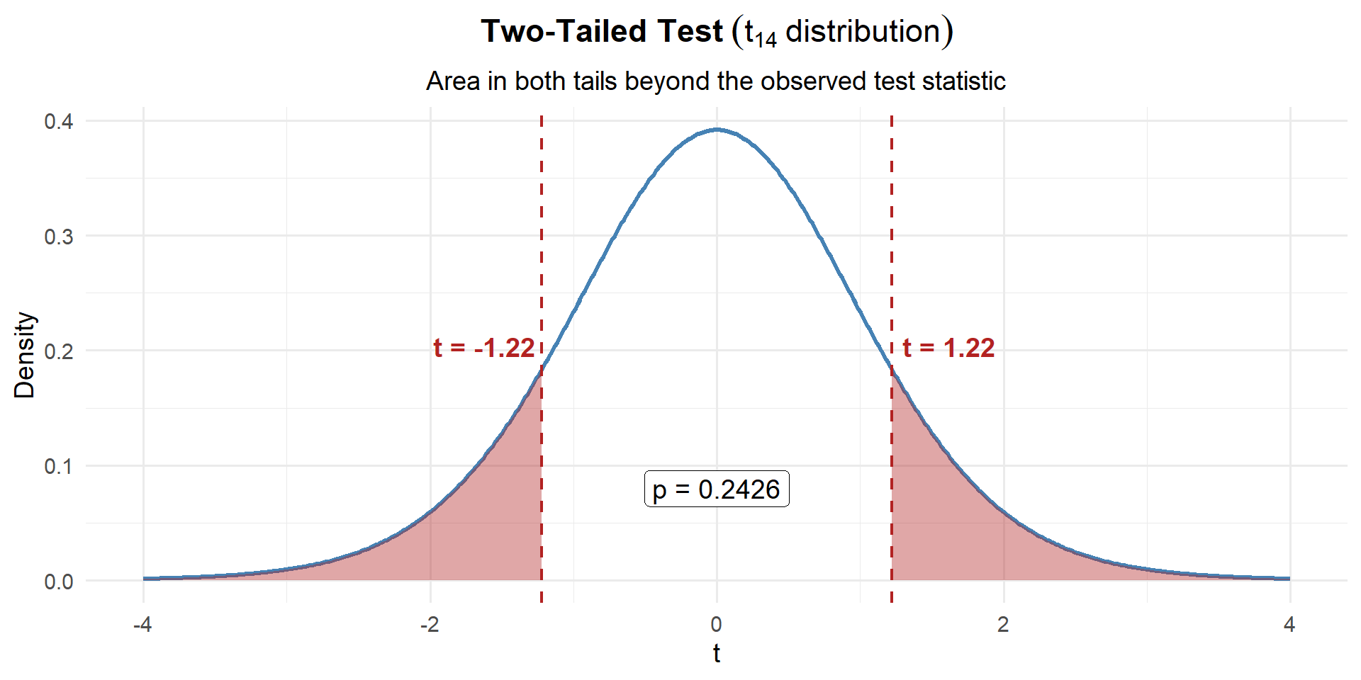 \[p\text{-value} = 2 \times P(t_{14} \geq |1.22|) = 0.2415\]
