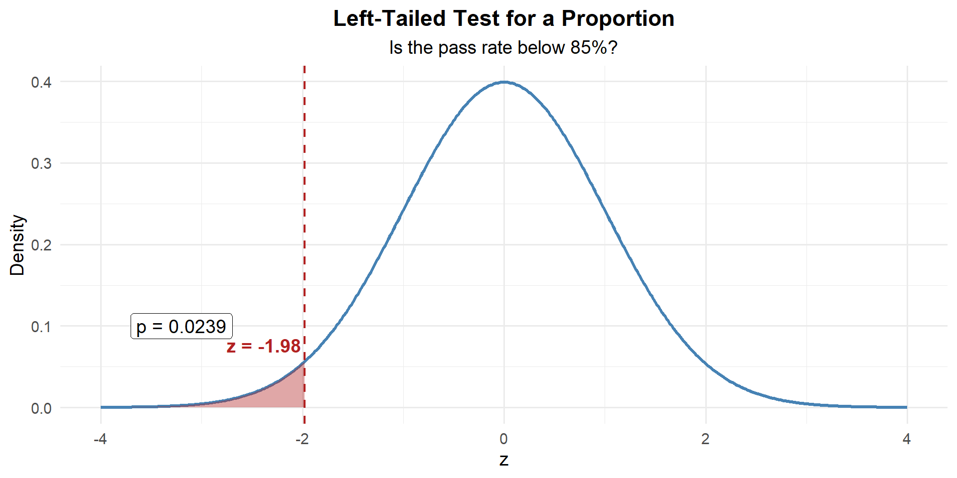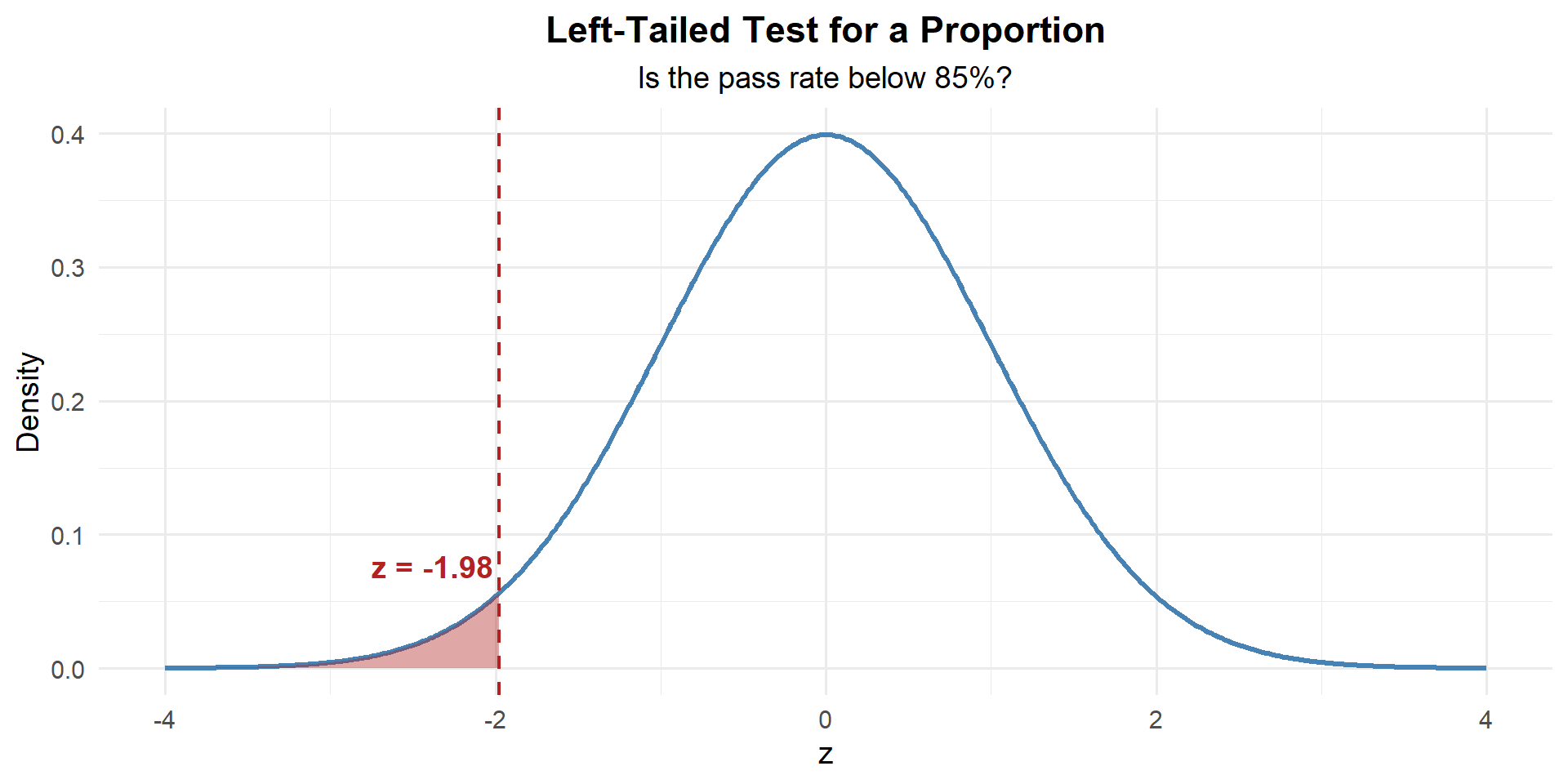 Our sample proportion is 1.98 standard errors below what \(H_0\) claims.