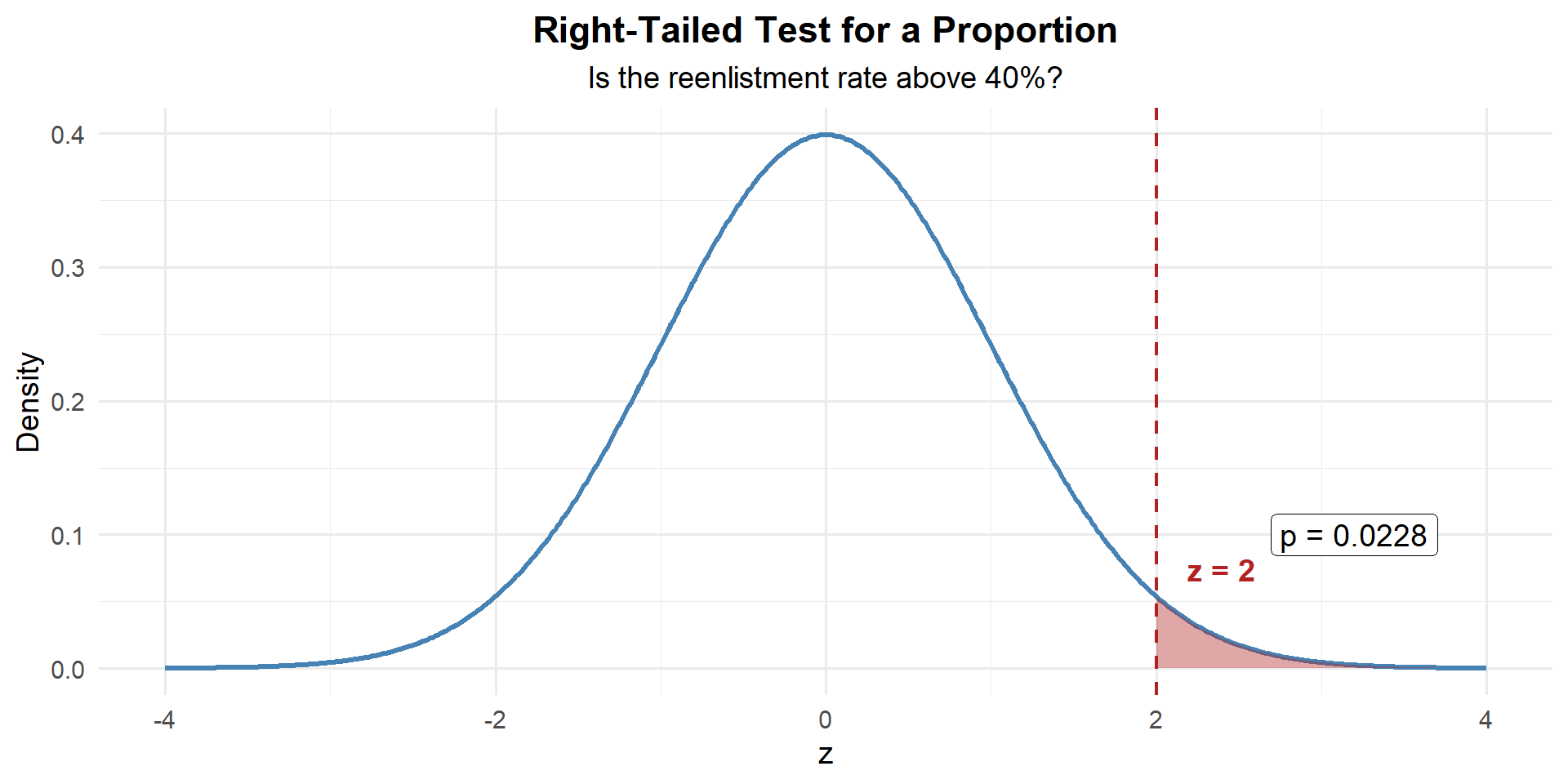 Our sample proportion is 2.08 standard errors above what \(H_0\) claims.