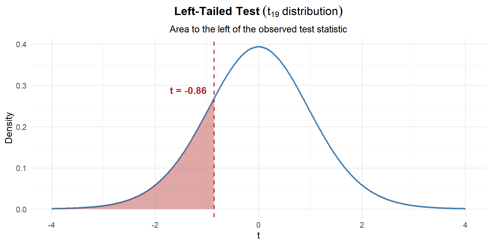 \[p\text{-value} = P(t_{19} \leq -0.86) = 0.1999\]