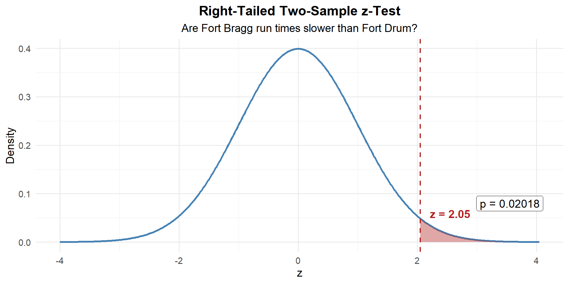 pnorm()for \(p\)-values - CI for \(\mu_1 - \mu_2\): \((\bar{x}_1 - \bar{x}_2) \pm z_{\alpha/2} \cdot SE\) — if it doesn’t contain 0, reject \(H_0\)