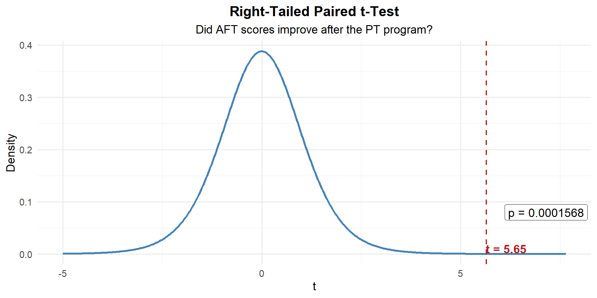 \(p < 0.001 \leq 0.05\). We reject \(H_0\). At the 5% significance level, there is strong evidence that the PT program improved AFT scores. The average improvement was 12.1 points.
