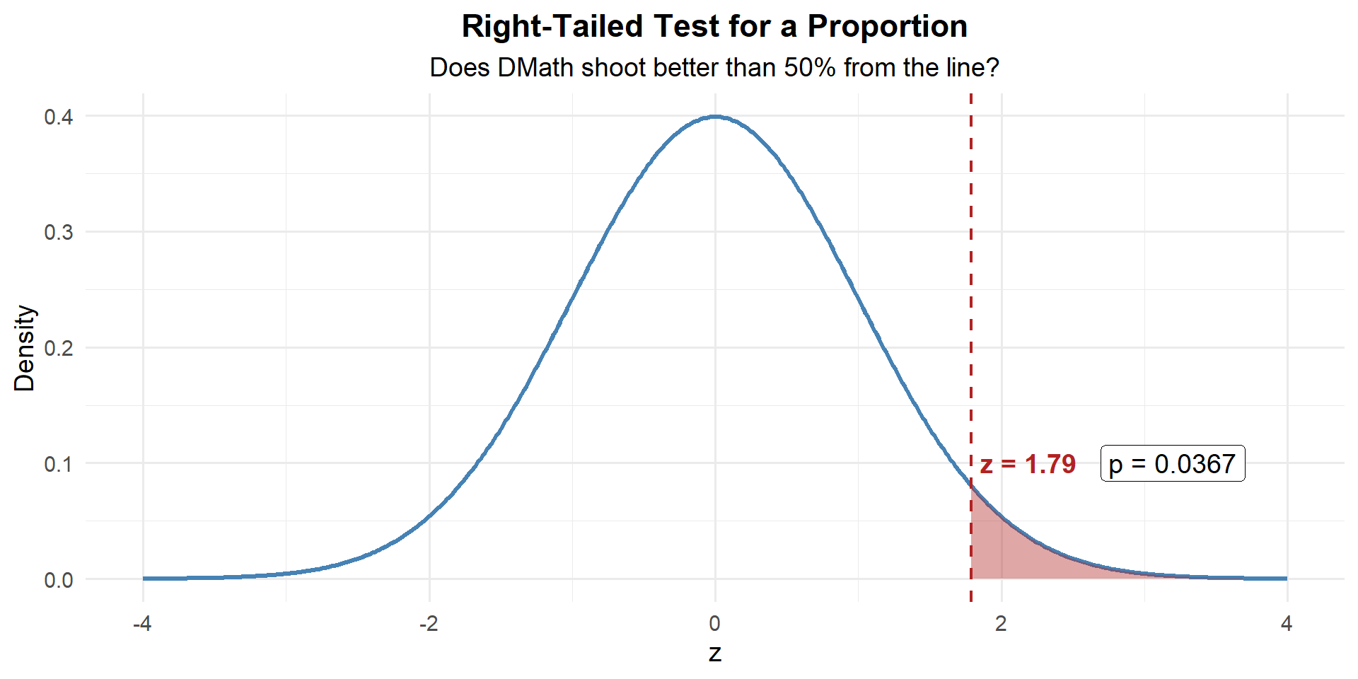At \(\alpha = 0.05\): \(p = 0.0368 \leq 0.05\). We reject \(H_0\). At the 5% significance level, there is sufficient evidence that DMath shoots better than 50% from the free-throw line.
