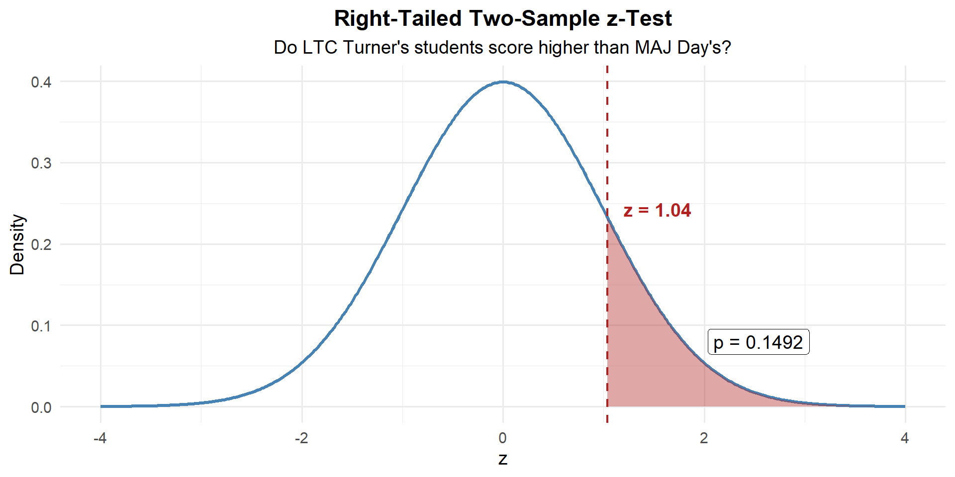 - \(p = 0.0285 < 0.05\), so we reject \(H_0\). At the 5% significance level, there is sufficient evidence that more than 30% of cadets spend over 4 hours daily on their phones.