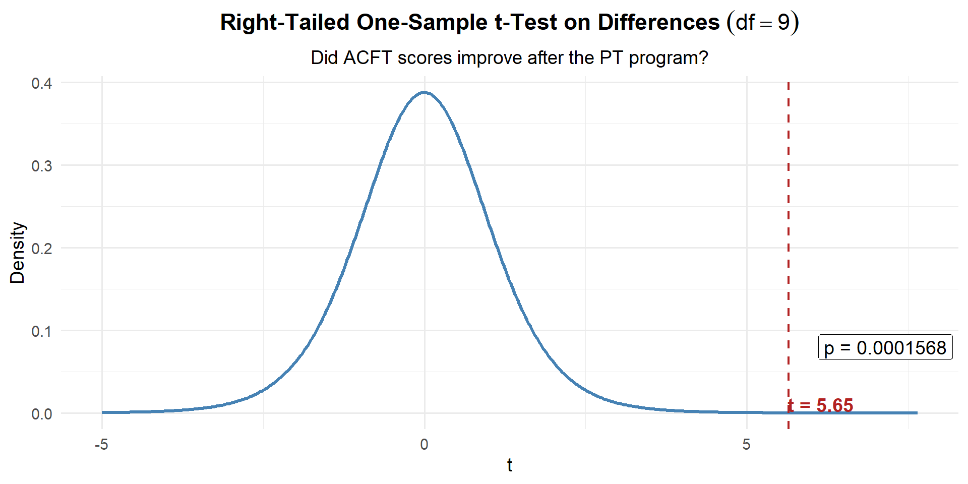 \(p < 0.001 \leq 0.05\). We reject \(H_0\). At the 5% significance level, there is strong evidence that the PT program improved ACFT scores. The average improvement was 12.1 points.