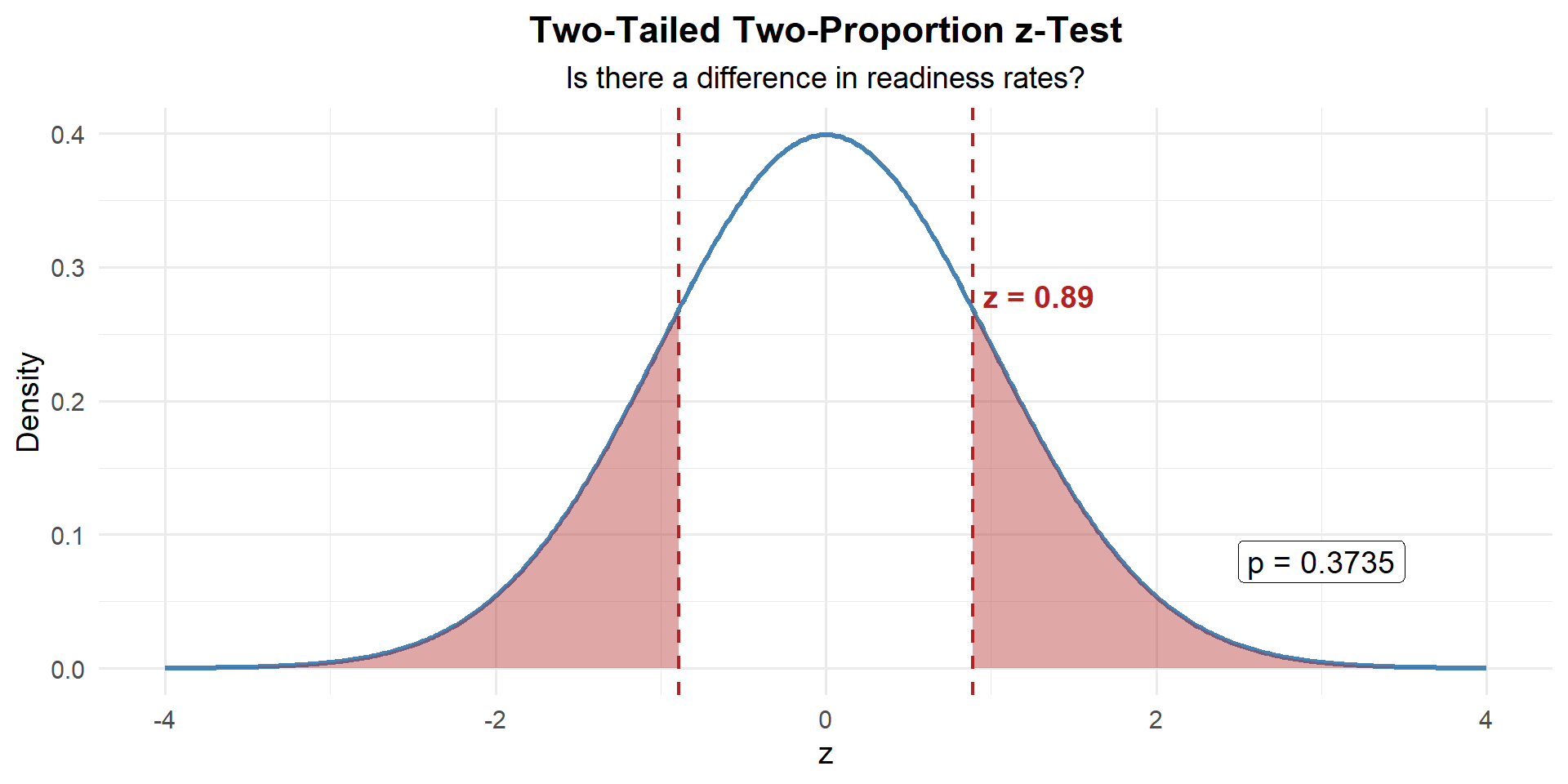 - \(p = 0.1139 > 0.05\), so we fail to reject \(H_0\). At the 5% significance level, there is not sufficient evidence that Battalion A has a higher promotion board pass rate.