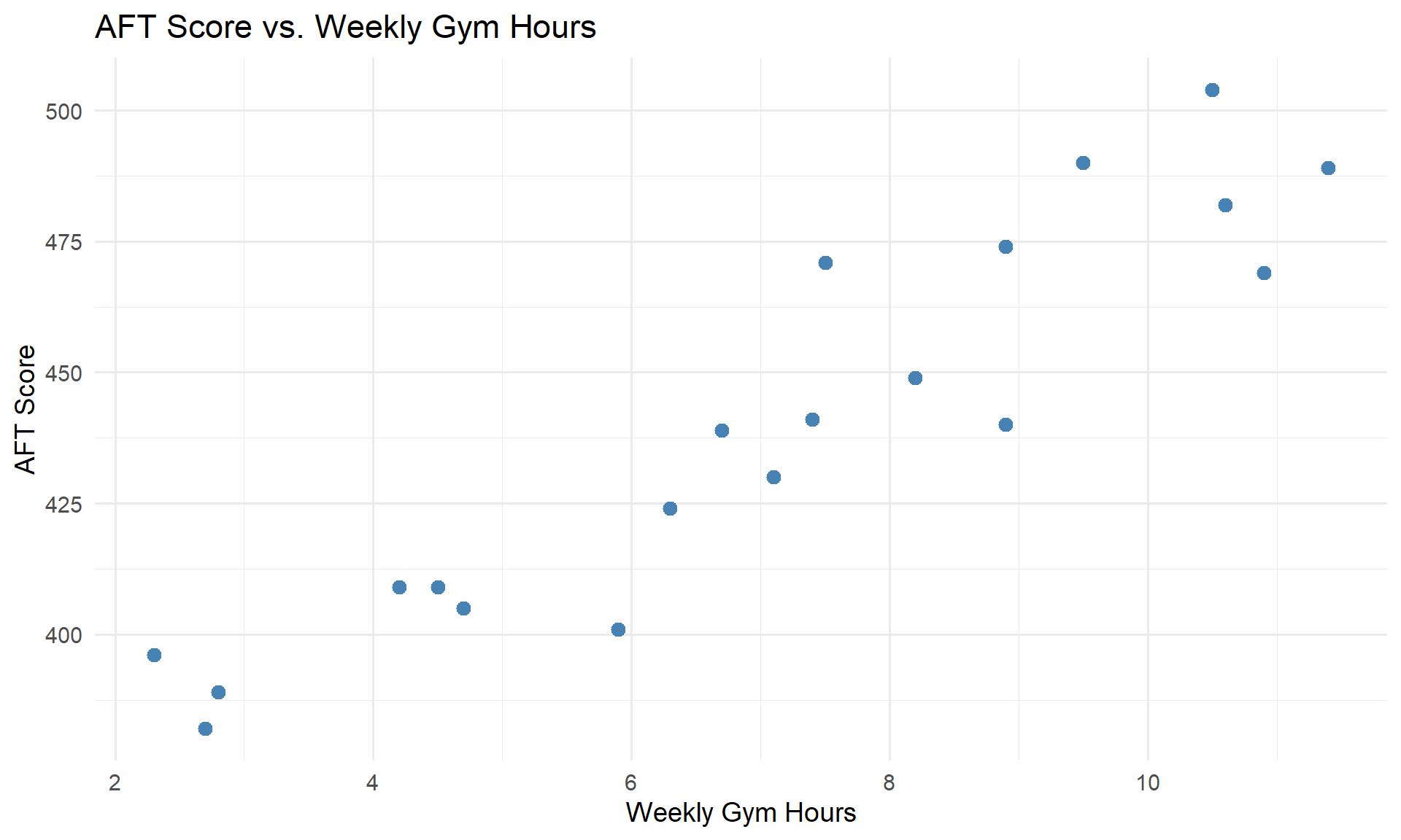 A company commander wants to know if time spent in the gym predicts AFT scores. Data from 20 Soldiers: