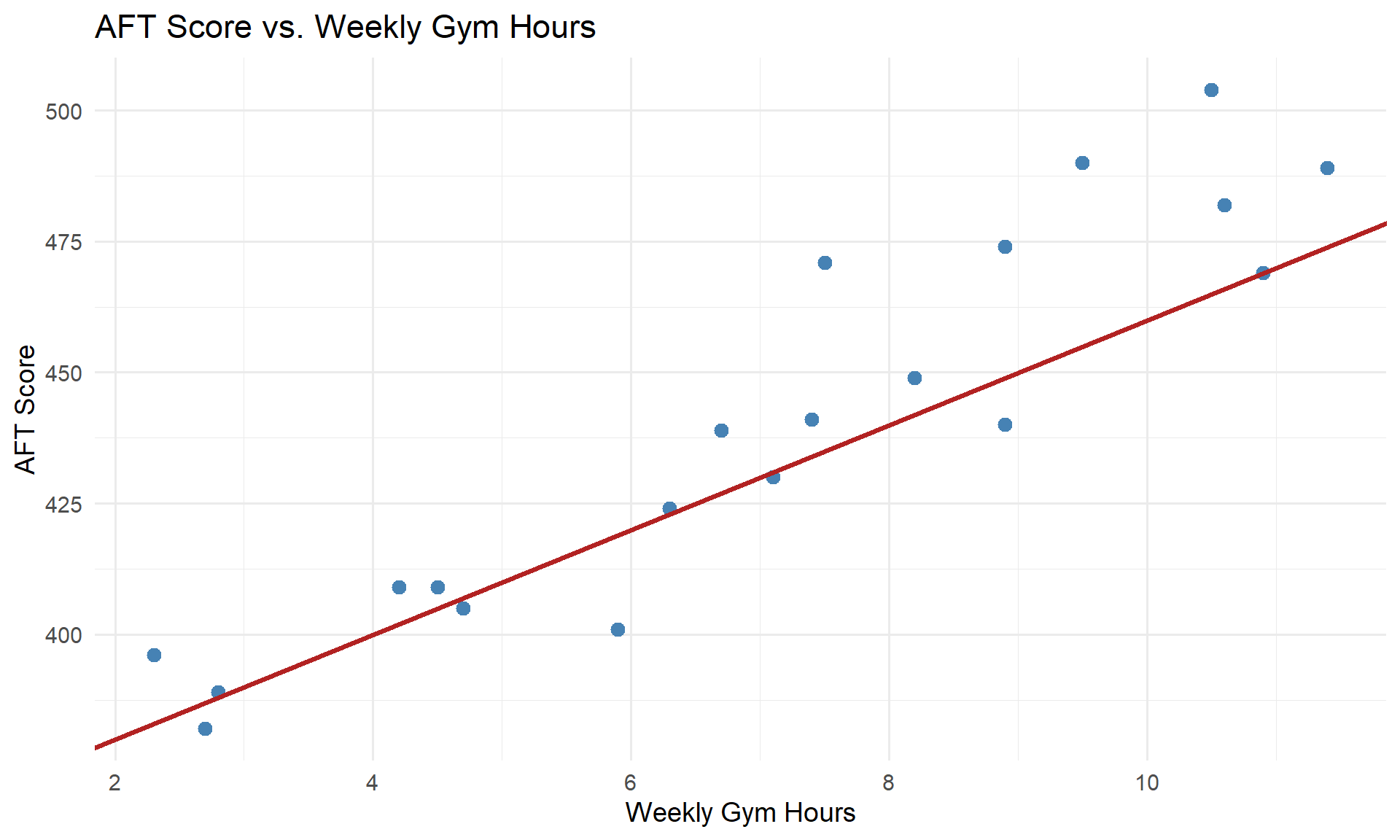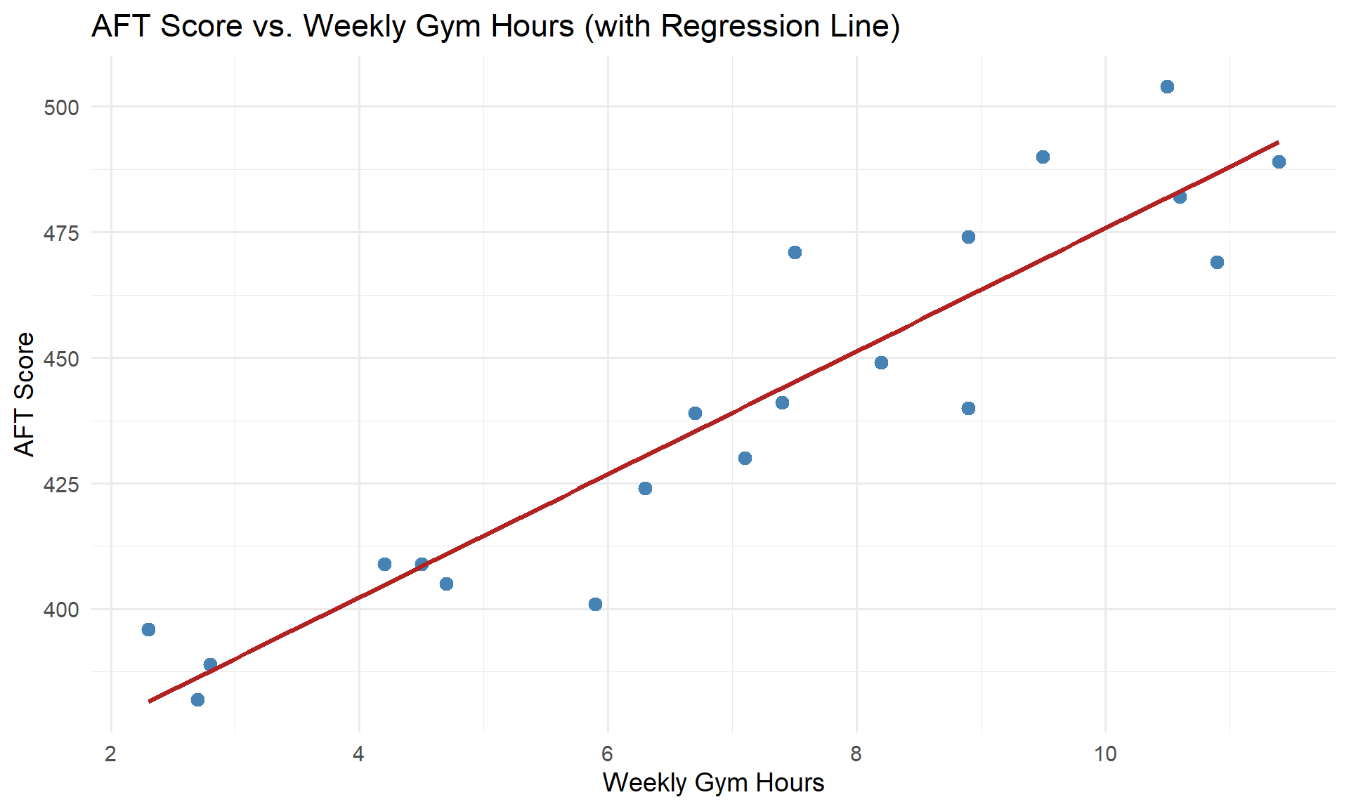 \[\widehat{\text{AFT Score}} = 353.42 + 12.23 \cdot \text{Gym Hours}\]
