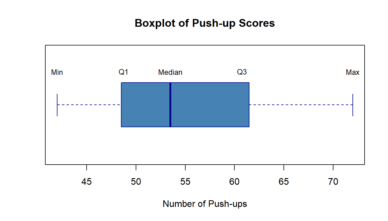| Whiskers | Extend to min/max (or 1.5×IQR from box) |