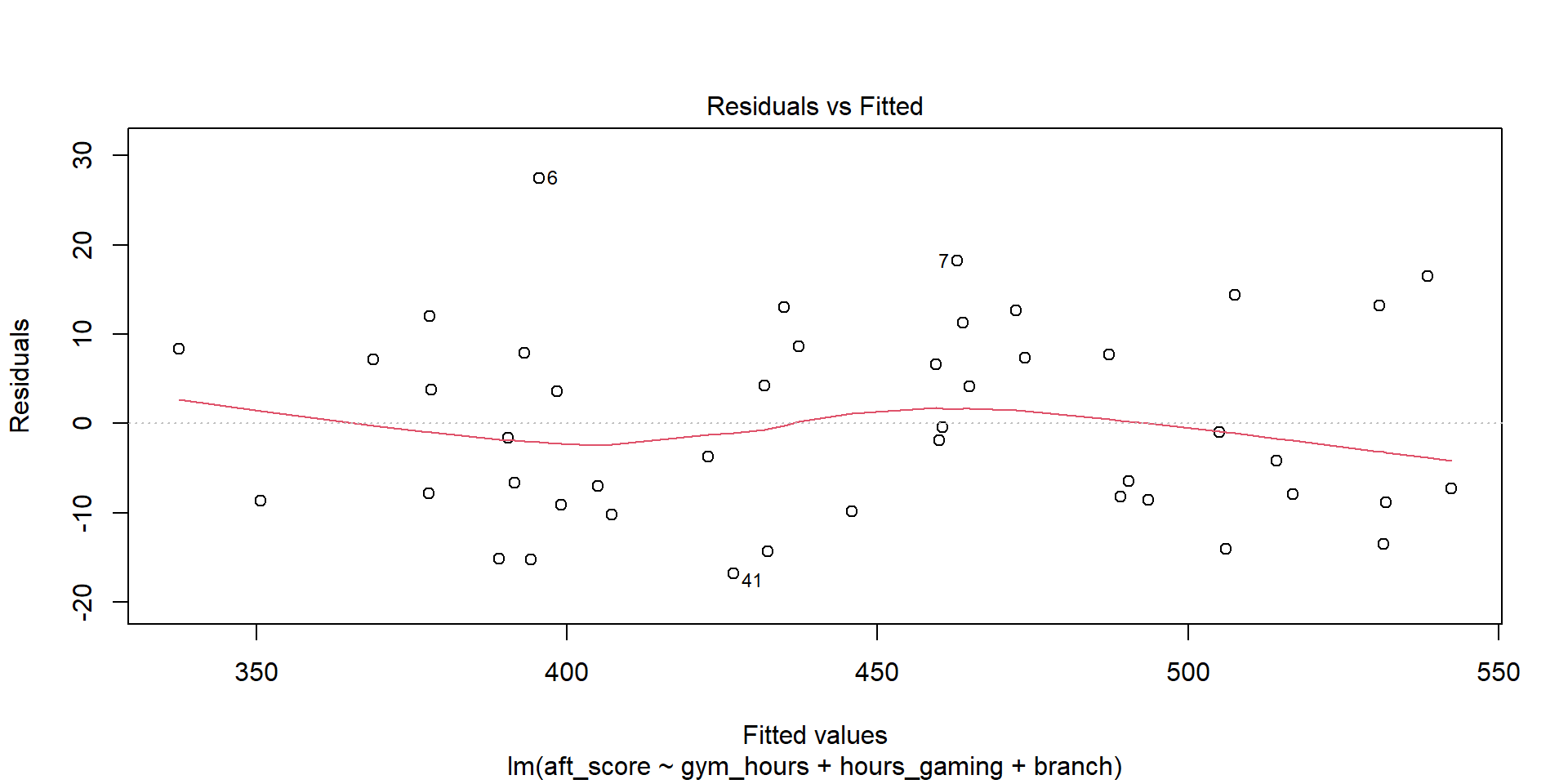 | Linearity | Residuals vs. Fitted | Flat red line – OK |