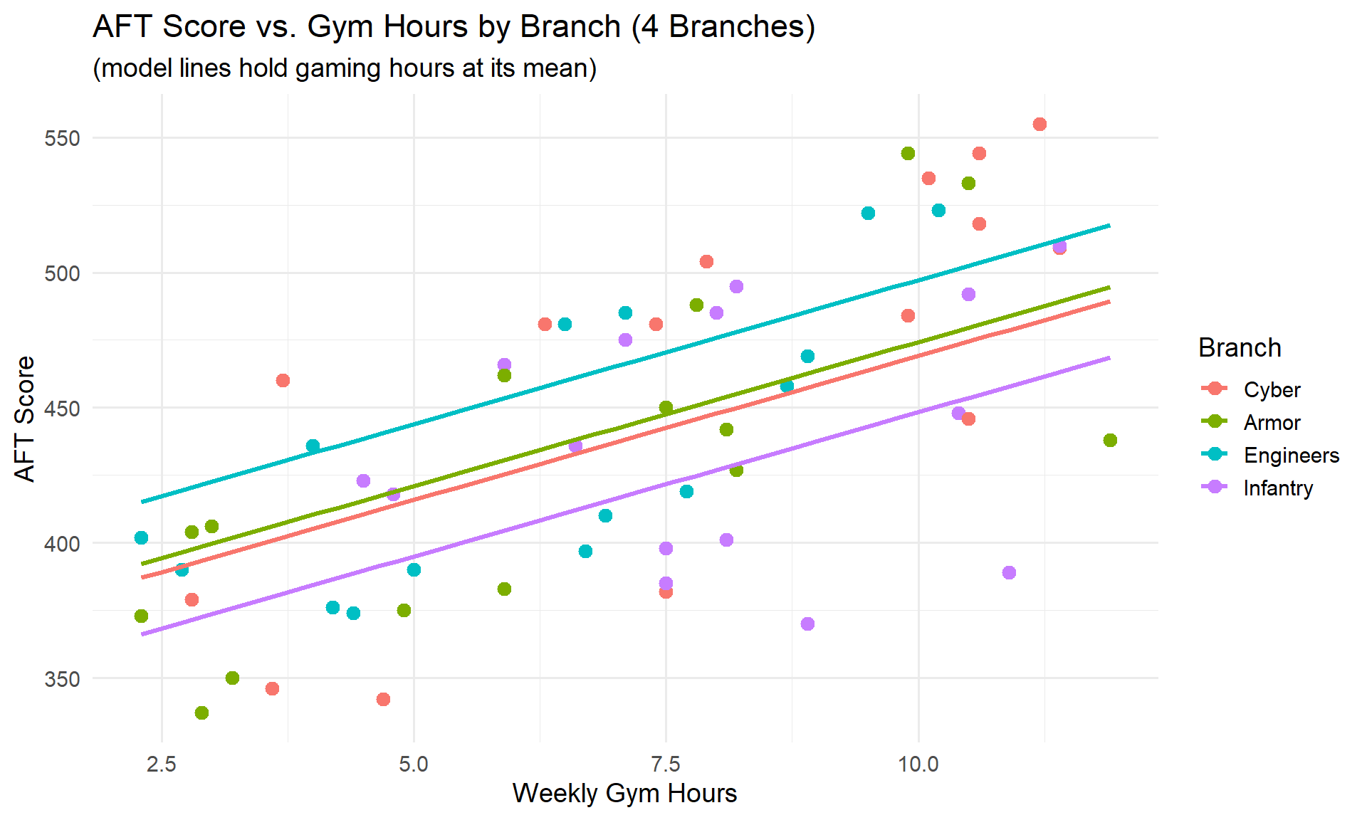 Last class, we built up from a simple model to one with categorical predictors. Here’s the final model we ended with – predicting AFT scores using gym hours, gaming hours, and branch (Cyber, Engineers, Infantry):